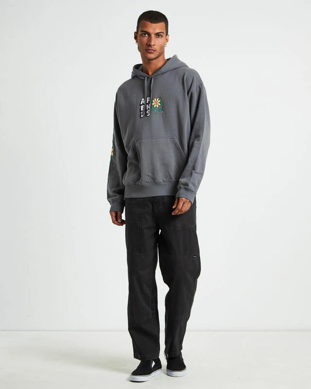 The Flowerbed Recycled Pull On Hoodie by Afends is a winter staple with it’s soft fleece interior and comes in a steel grey colourway. This style features a kangaroo pouch pocket, thick hood with adjustable drawstrings, ribbed trims, front and sleeve graphic prints.