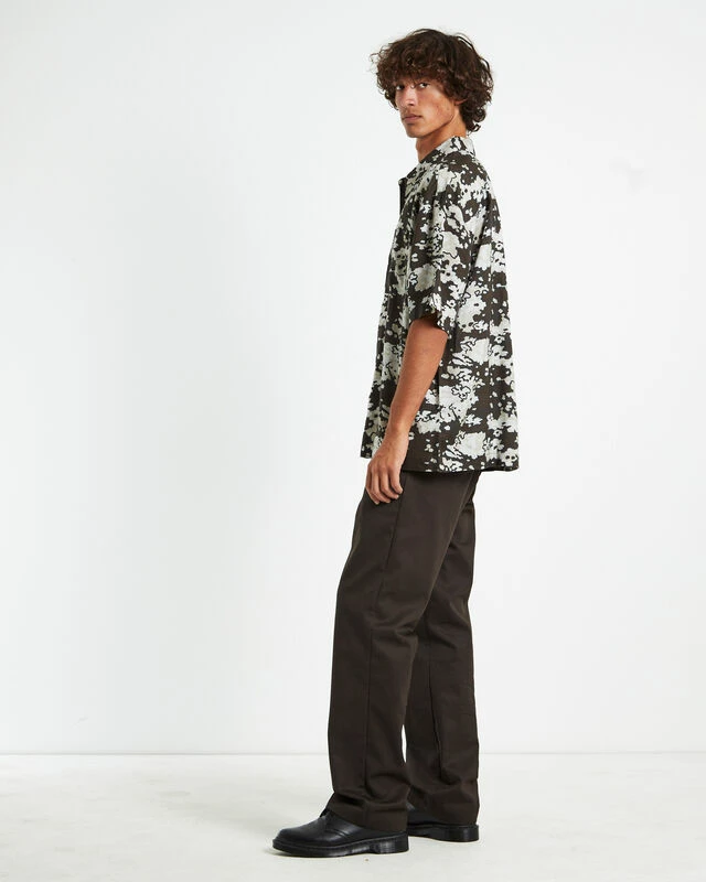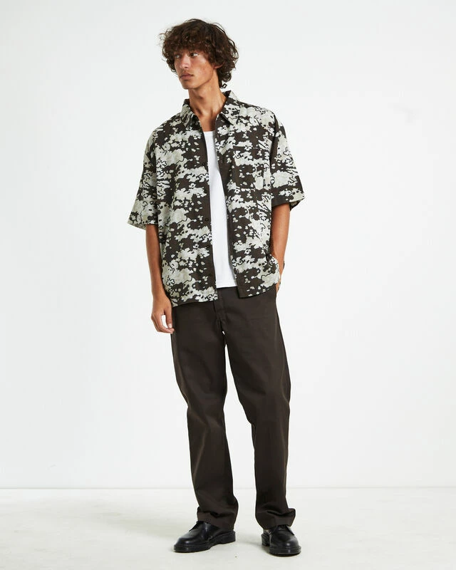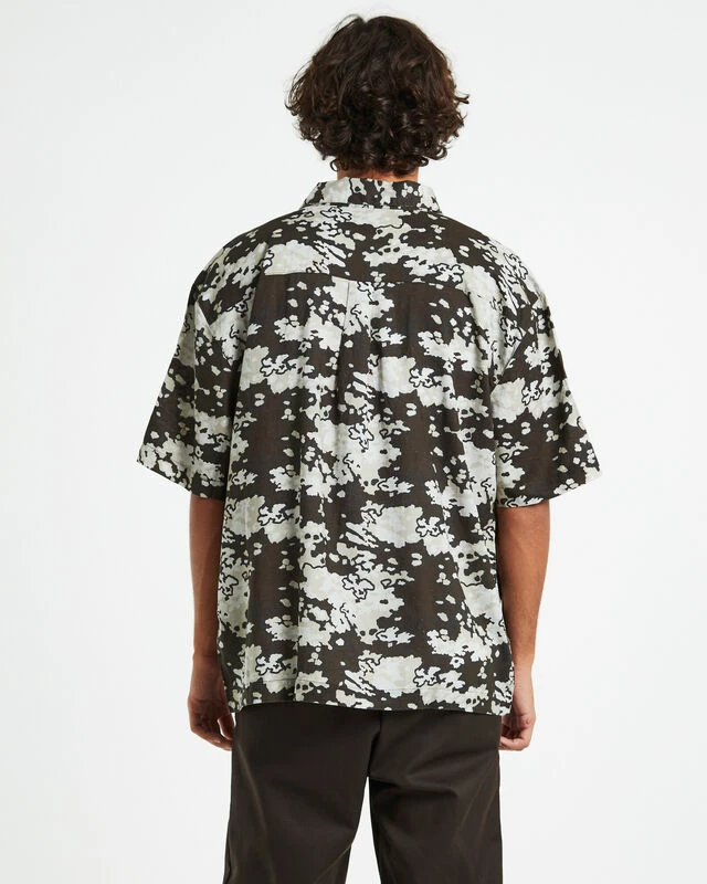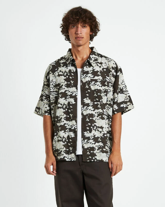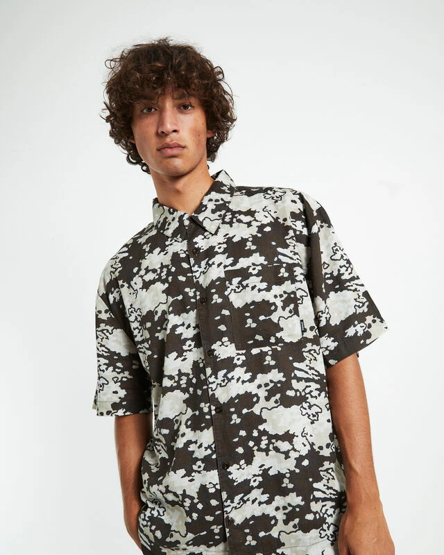 The Jungle Hemp Short Sleeve Shirt by Afends comes in a unique earth camo pattern. The shirt is designed with a button-up front, collared neckline, left chest pocket and a relaxed fit.