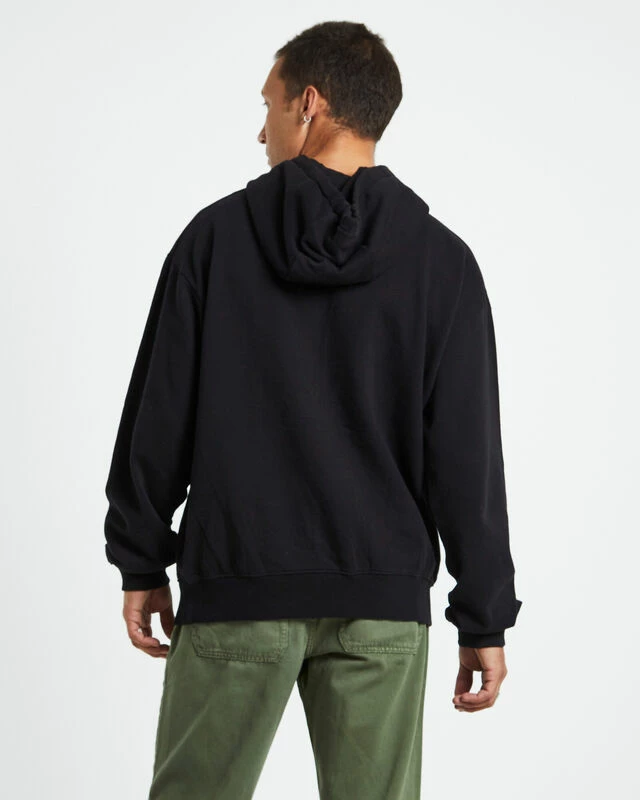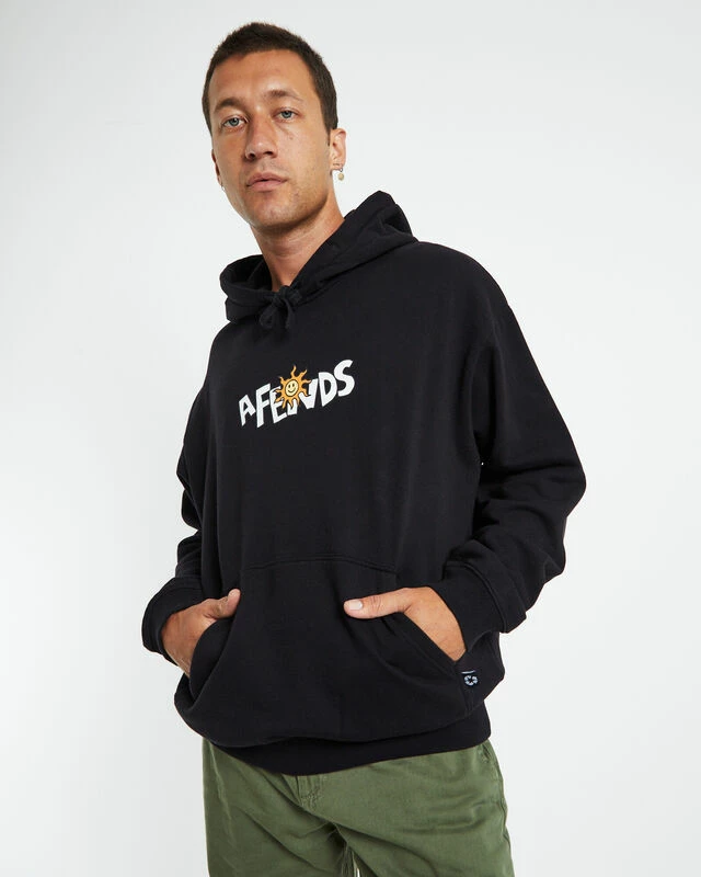 The Sunshine Hoodie by Afends comes in a black colourway with graphic print at centre chest. Constructed with a drawstring hood, long-sleeve design, front kangaroo pocket, ribbed trims and made in an eco-friendly organic and recycled cotton fabrication.