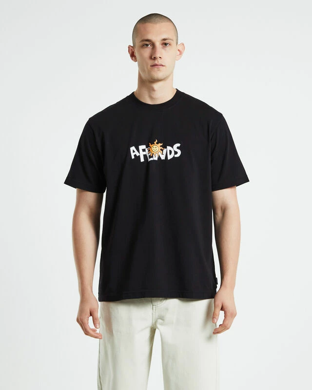 The Sunshine Recycled Retro Fit Short Sleeve T-Shirt by Afends comes in a black colourway and features signature branding at the centre chest. This style is designed with a regular fit, short sleeves, ribbed crew neckline and straight hem. Style back with beige jeans and sneakers for a chilled look.