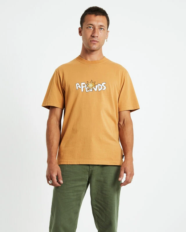 The Sunshine Recycled Retro Fit T-Shirt by Afends comes in a mustard colourway and has a regular fit. This style is designed with signature branding at the centre chest, short sleeves, ribbed crew neckline and straight hem.