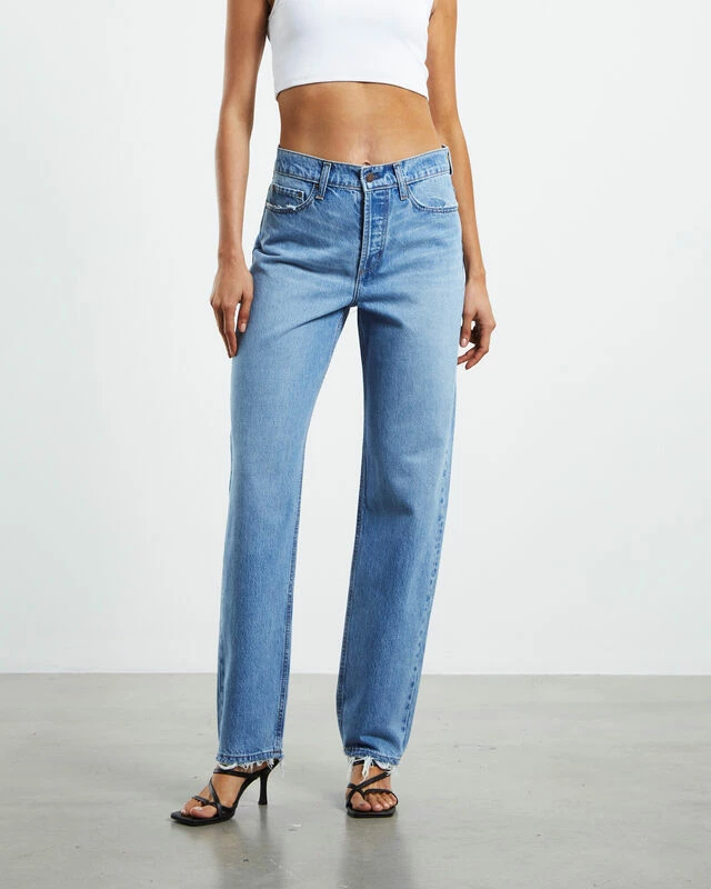 The Agnes Jeans by Nobody Denim are a mid rise style that are a boyfriend fit. The jeans come in a mid blue wash and feature a straight leg profile, five pocket styling, button fly and raw edge detailing. Complete the look with a fitted tank and heels for a date night look.