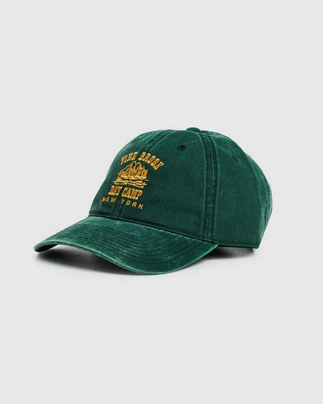The Camp Pine Brook Ball Park Cap by American Needle comes in a bottle green colourway and is a baseball style cap. The hat features an embroidered Pine Brook logo on the front, curved brim, six panels and adjustable back strap.