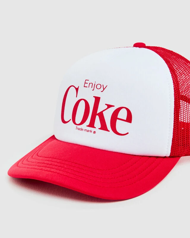 The Enjoy Coke Sinclair Trucker Cap by American Needle is a red colourway with Coke signature branding. The cap is adjustable and features mesh back panels for breathability.