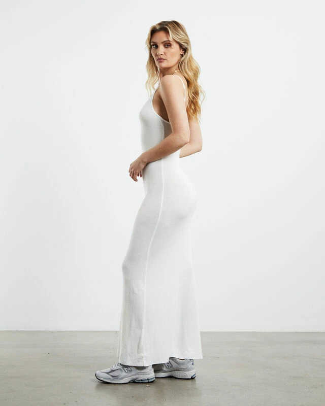 The April Rib Maxi Dress by SNDYS comes in a white colourway. The dress is stretchy and is crafted from a soft knitted fabrication. Featuring adjustable straps and a scoop back with crossover detail. Dress it down with a tote bag and sneakers for an everyday look.