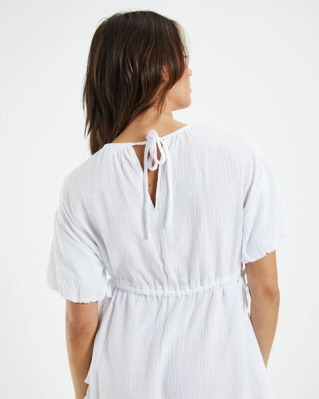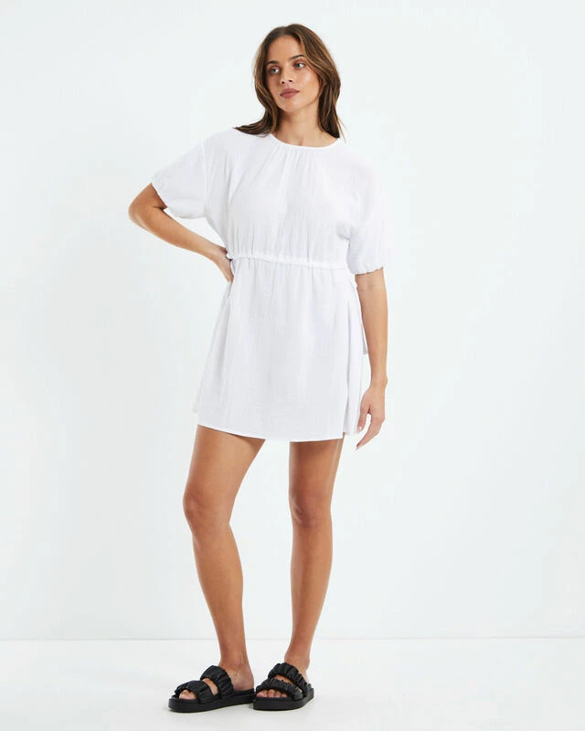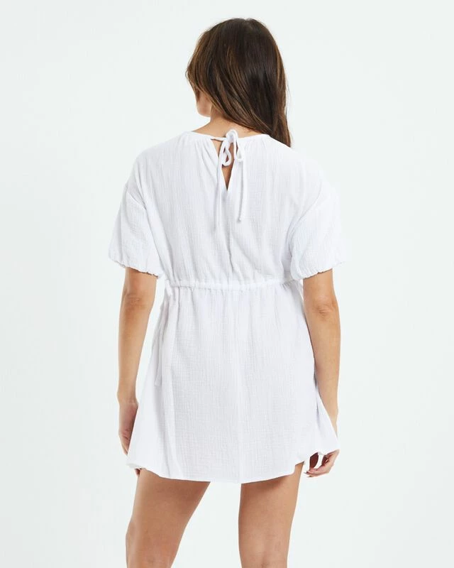 The Banji Easy Beach Dress by Subtitled comes in a white colourway. The dress is mini in length and lined. Featuring a wide round neck, adjustable waistband and tie-up neckband at reverse. Pair it back with Birkenstocks and a straw hat for a go-to summer fit.