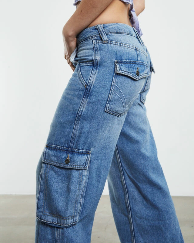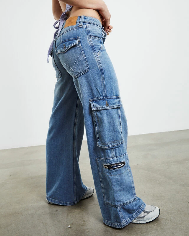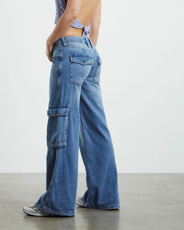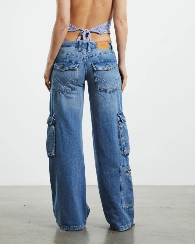 The Low Rise Puddle Jeans by BDG Urban Outfitters are crafted from a rigid cotton denim. The jeans are low waisted and come in a mid blue wash. Featuring a straight leg profile, cargo pocket styling, zip fly with button closure and signature branding. Complete the look with a cropped baby tee and Converse for an easy everyday fit.