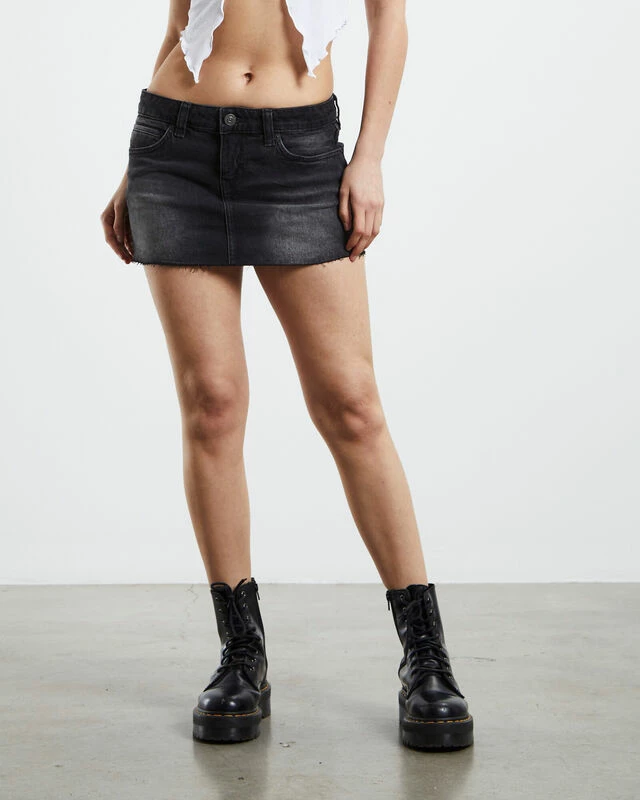 The Pelmet Skirt by BDG Urban Outfitters is a low rise style with a short hem. The skirt comes in a black wash and is crafted from a cotton denim. Featuring a zip fly with button closure, three pockets and signature branding. For an edgier look, pair it back with a leather bustier and Dr Martens.
