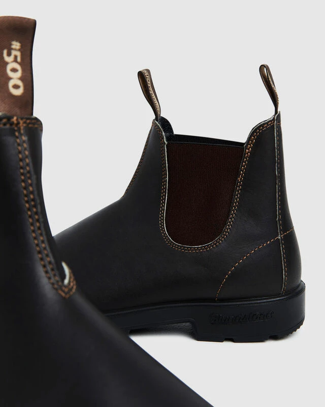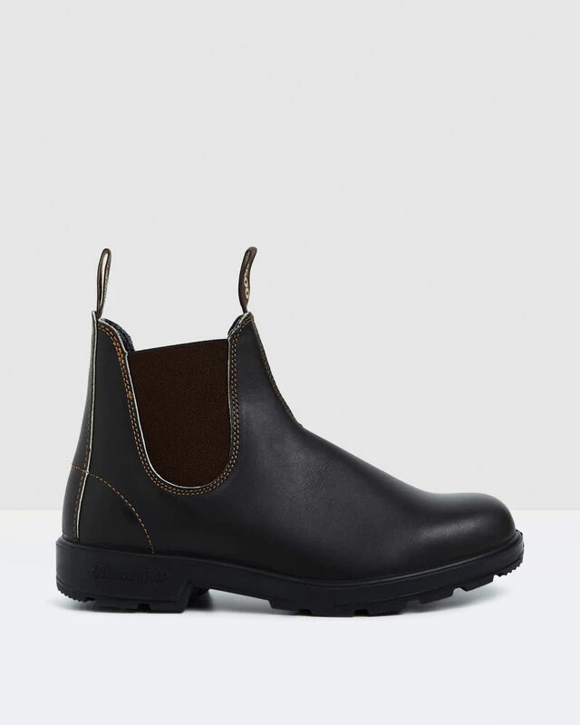 The 500 Elastic Side Boot by Blundstone is a round toe boot that features elastic sides and branded pull tabs at the ankle. This style features Blundstone branding at the outsole.