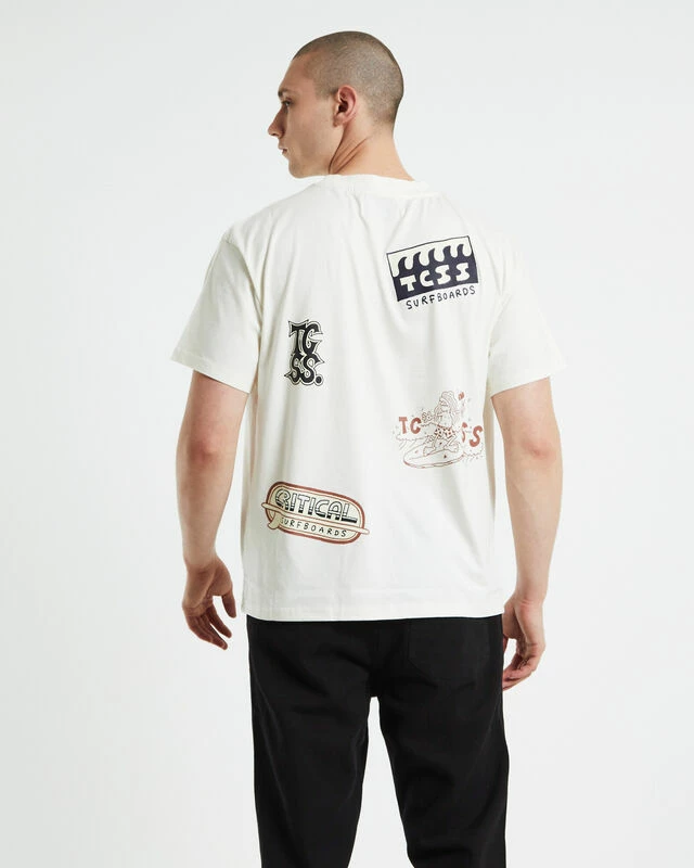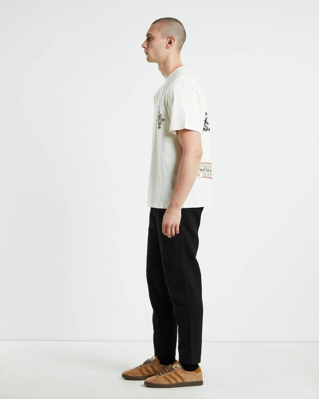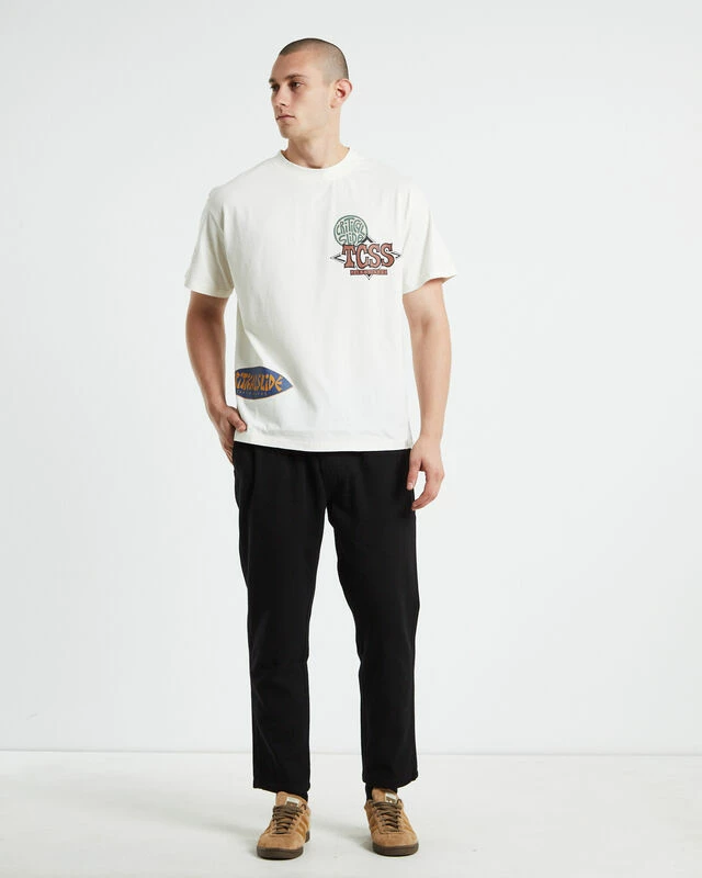 The Bumper Band Short Sleeve T-Shirt by The Critical Slide Society comes in a vintage white colourway. This t-shirt is designed in a regular fit and features signature branded graphics at the front and reverse, ribbed crew neckline, short sleeves and straight hem. Pair back with black pants and sneakers for a casual day out.