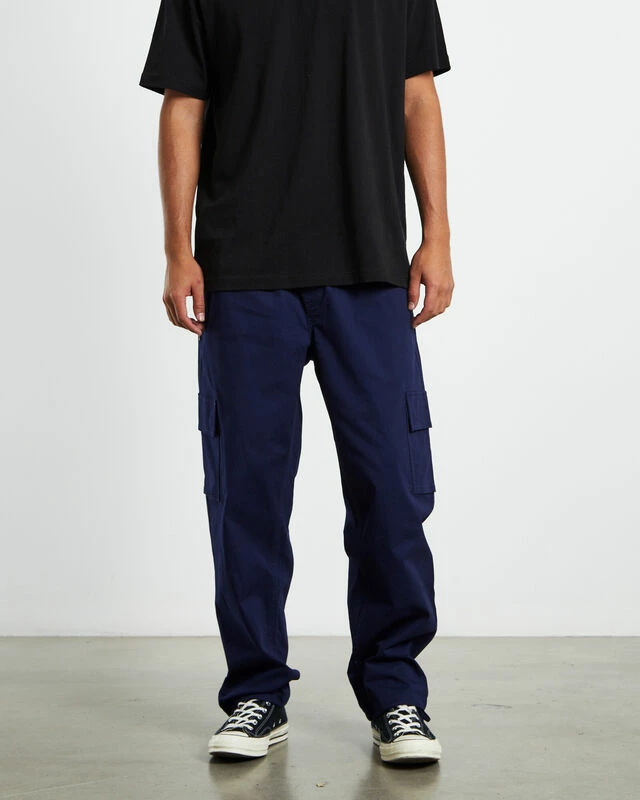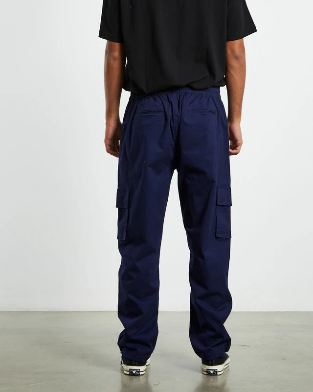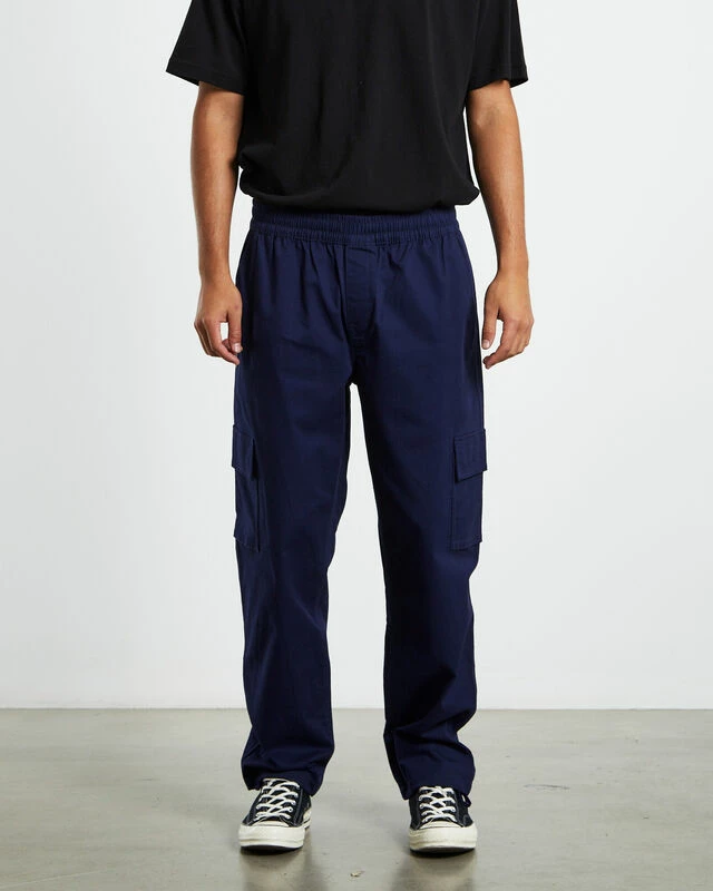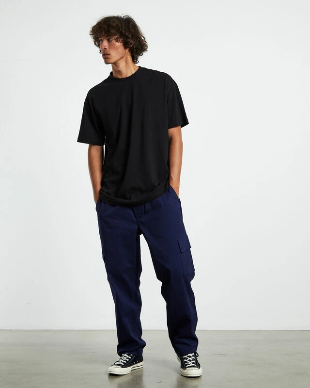 The Cargo Pants by Taikan comes in a navy colourway. This style is constructed in super soft cotton twill with elastic waist and hidden draw cords at the bottom cuff. Pair these with a black hoodie and a pair of sneakers to complete a casual day look.