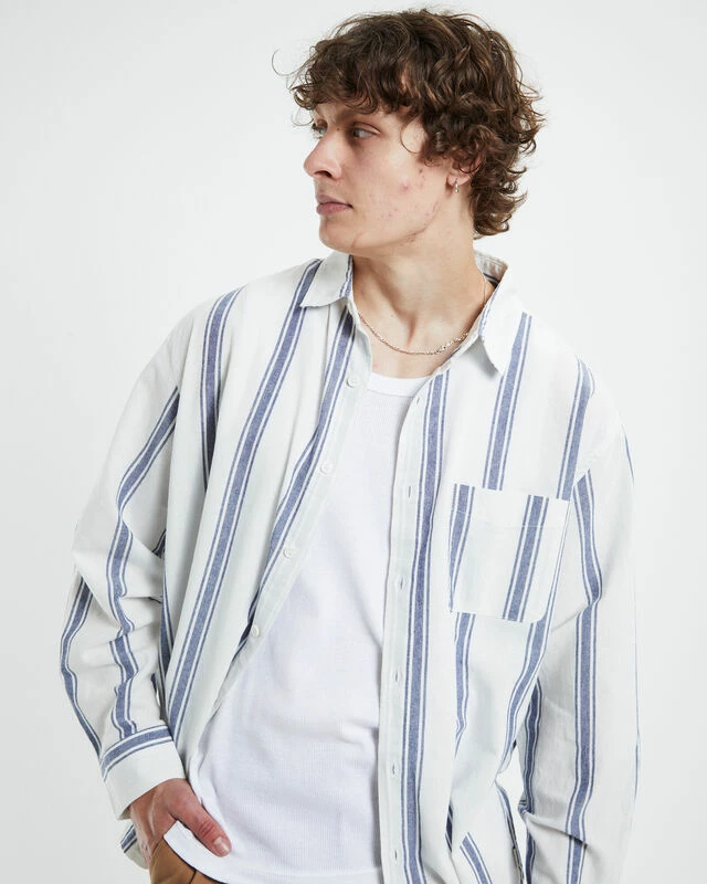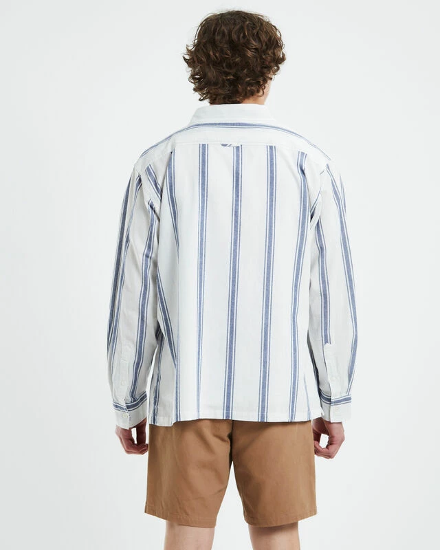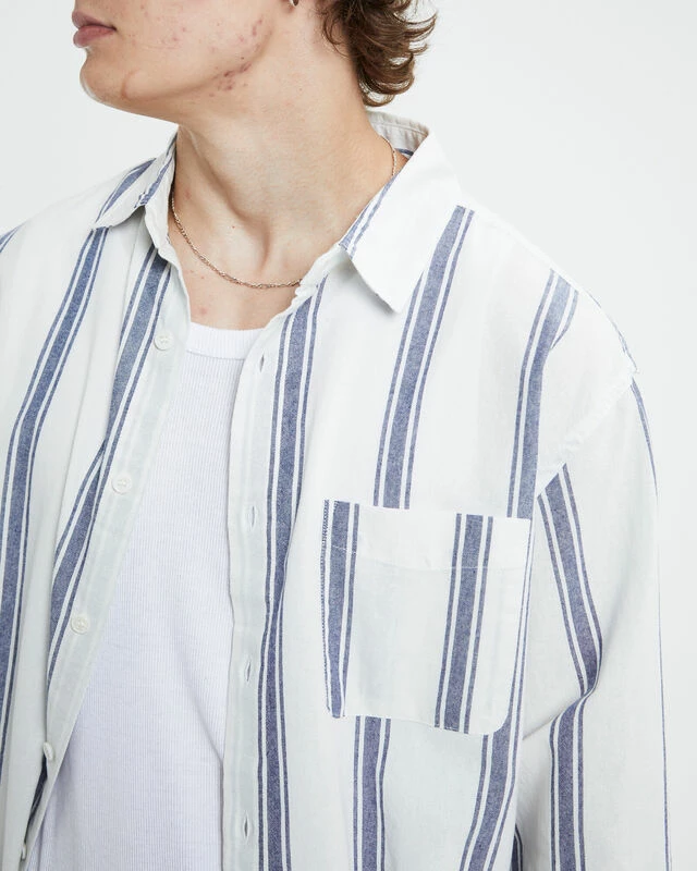 The Cody Long Sleeve Shirt by Arvust is crafted from a soft cotton fabrication. The shirt comes in a white and navy striped design and is a regular fit. Featuring a collared neckline, left chest pocket, long sleeves and a button-up front. Layer it over a white tee and pair back with tailored shorts and sneakers for a date night fit.
