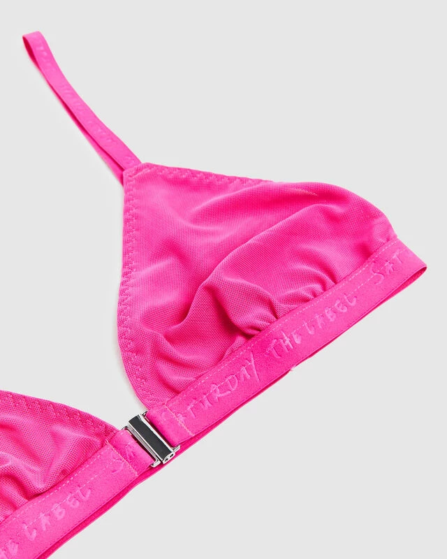 The Coffee Club Bralette by Saturday The Label is crafted from a lush mesh fabrication with an embossed elastic banding under the bust for support. This style comes in a neon pink colourway and features a tri-cup design, silver hardware, front rod clasp and adjustable shoulder straps.