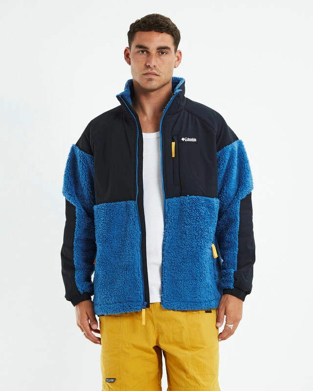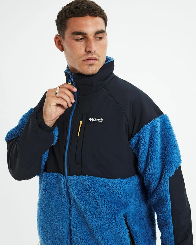 The Ballistic Ridge Full Zip Fleece Jacket by Columbia comes in an impulse blue colourway. This piece features contrast fleece panelling and a soft fleece interior, adjustable drawcords at the hem and collar, zip-up front and elasticated cuffs. The jacket is also designed with zippered side slip pockets, zippered chest pocket and signature branding at the left chest. Brighten up your winter wardrobe with this staple piece and style back with cargos and sneakers for a casual street vibe.