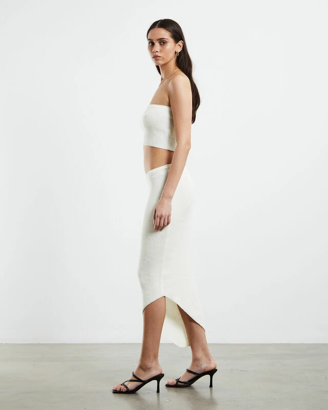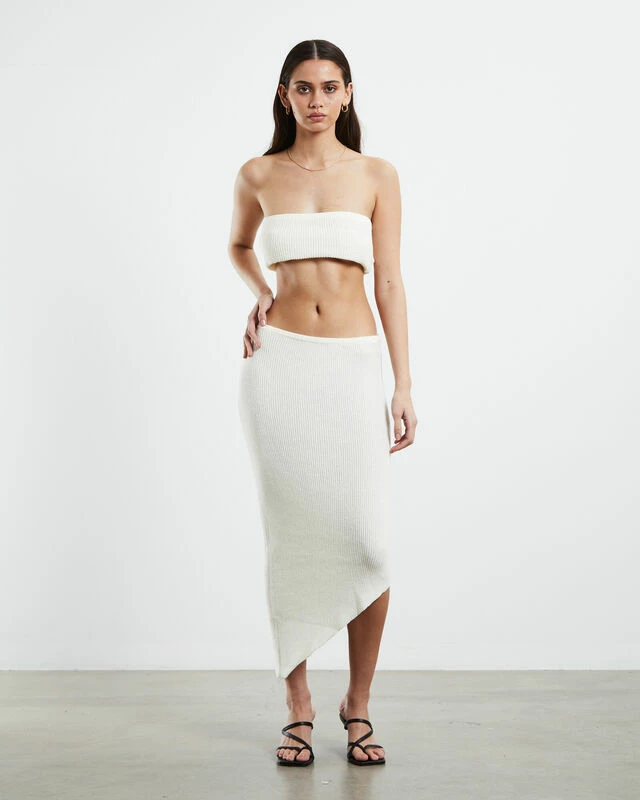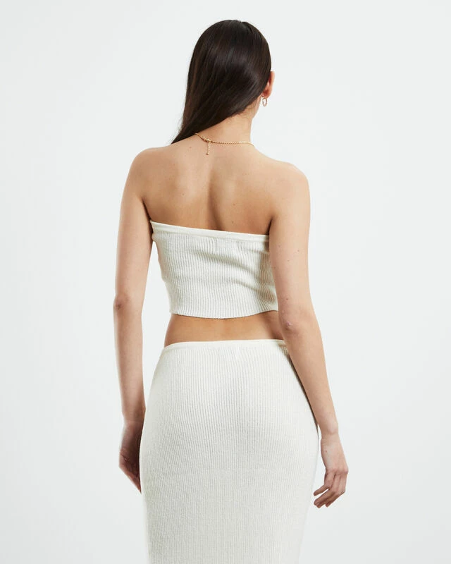 The Davia Knit Crop Top by SNDYS is a strapless piece that is crafted from a ribbed knitted fabrication. The top comes in an off-white colourway and features a cropped length. Make it a two-piece set with the Davia Skirt Pear Off White.
