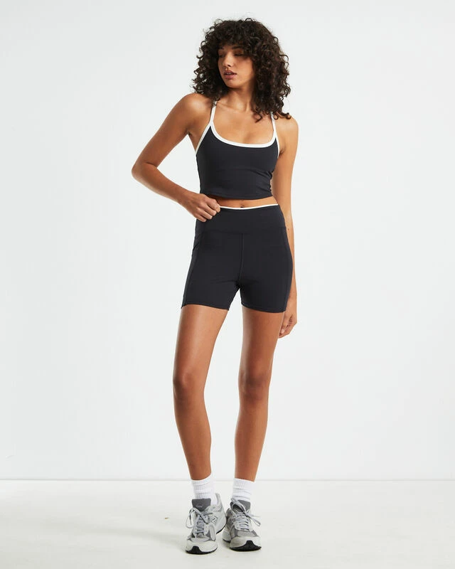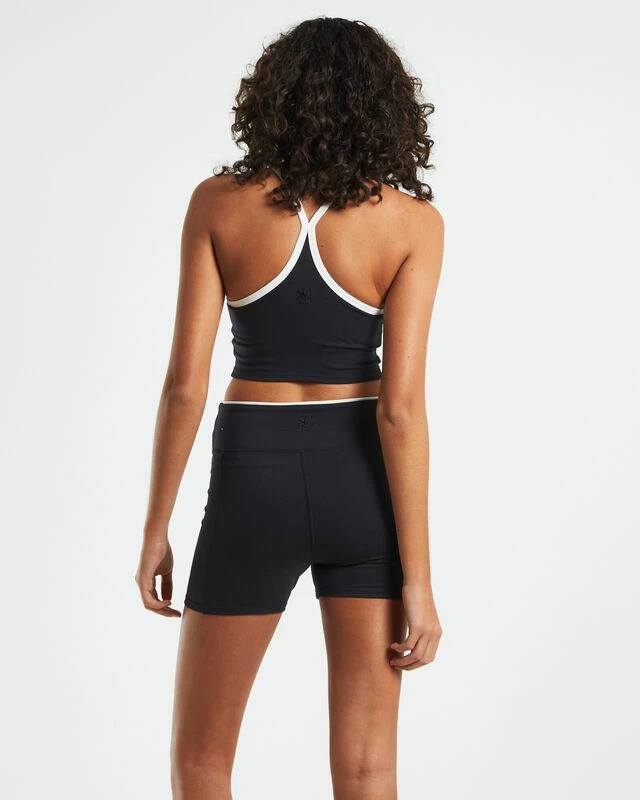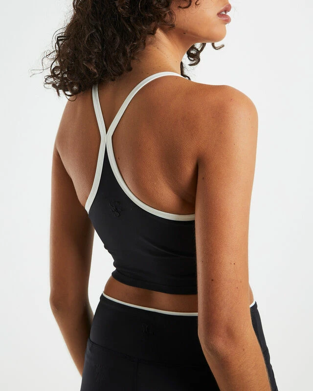 The Double Layered Cropped Tank Top by Subtitled Sports Club comes in a black colourway featuring white coloured trims and a cropped length. The top is constructed from a soft stretchy fabrication and is designed with a racer back design, scoop neckline and signature embroidered branding at the reverse.