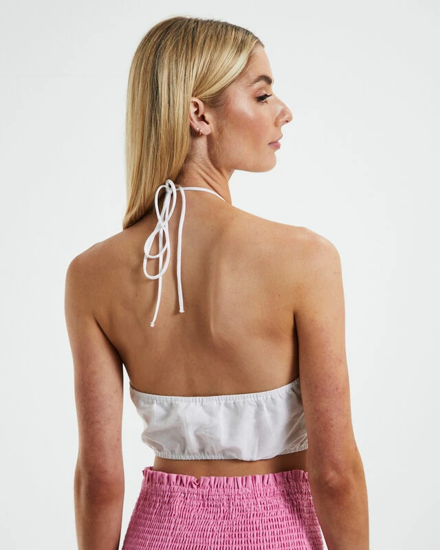 The Elin Tie Up Top by Subtitled comes in a white colourway and is constructed from a cotton/ linen blend . The top is super cropped in length and features a halter neckline, cut out detailing and rouching on centre chest. Throw on with a pair of linen pants and slides for an easy going look.