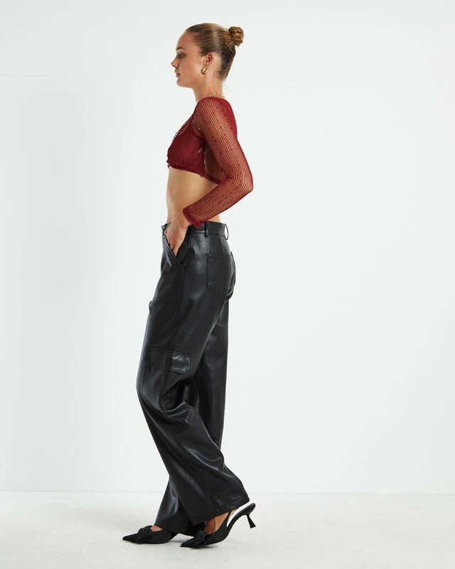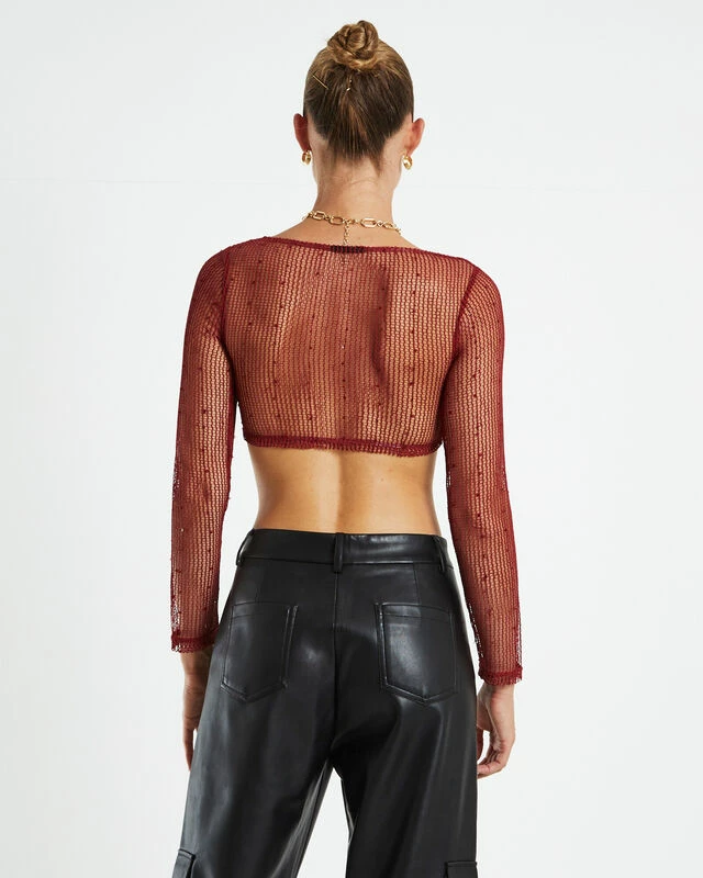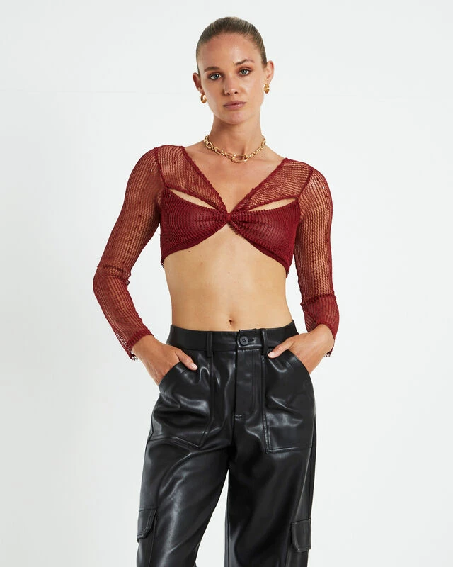 The Emery Shimmer Mesh Long Sleeve Top by Alice in The Eve comes in a deep rust shade. This top is designed with mesh fabric, long sleeves and a cropped length .Style it with a midi skirt and a pair of boots to tie the whole look together.
