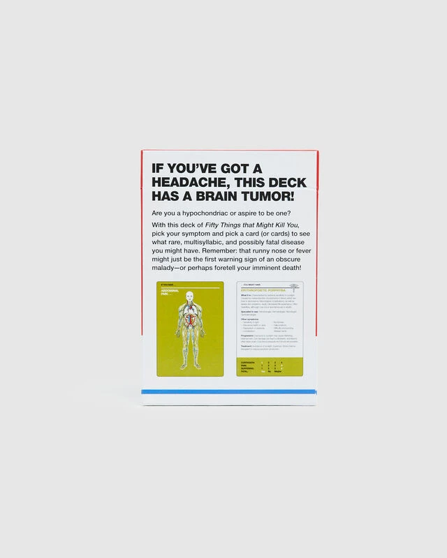 Are you a hypochondriac or aspire to be one? With this deck of Fifty Things that Might Kill You, pick your symptom and pick a card (or cards) to see what rare, multisyllabic, and possibly fatal disease you might have. Remember: that runny nose or fever might just be the first warning sign of an obscure malady-or perhaps foretell your imminent death!