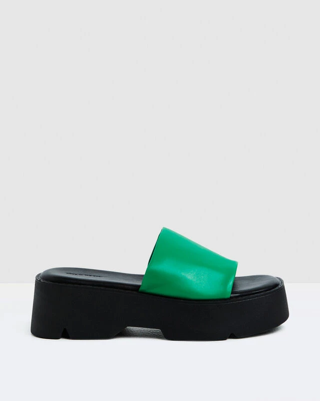 The Freya Flatform Slides by Alice In The Eve are a fun addition to any wardrobe this season. With a black flatform sole and green wide strap, these slides also feature a comfy round toe shape.