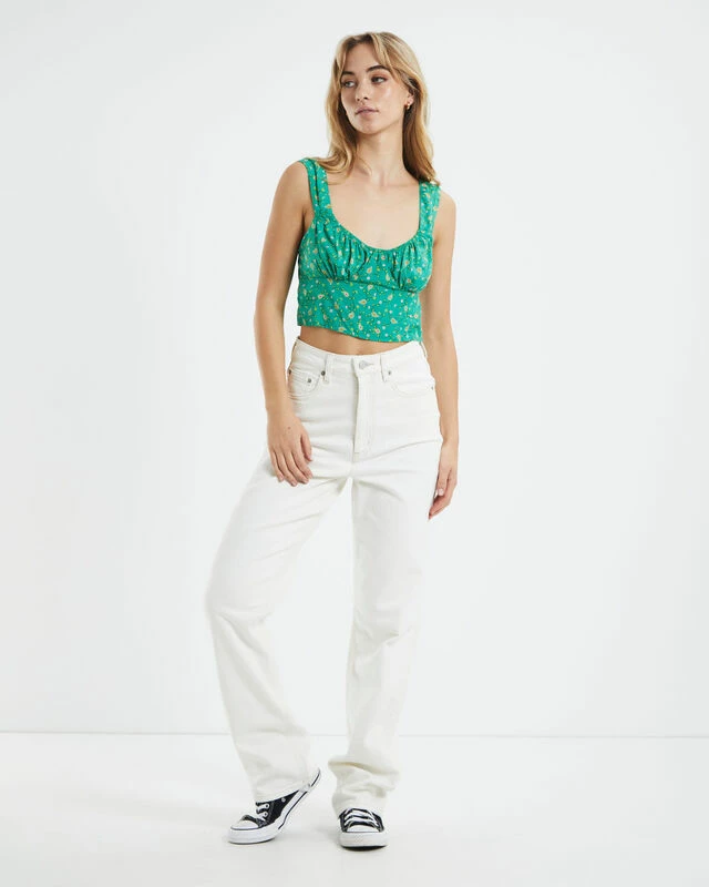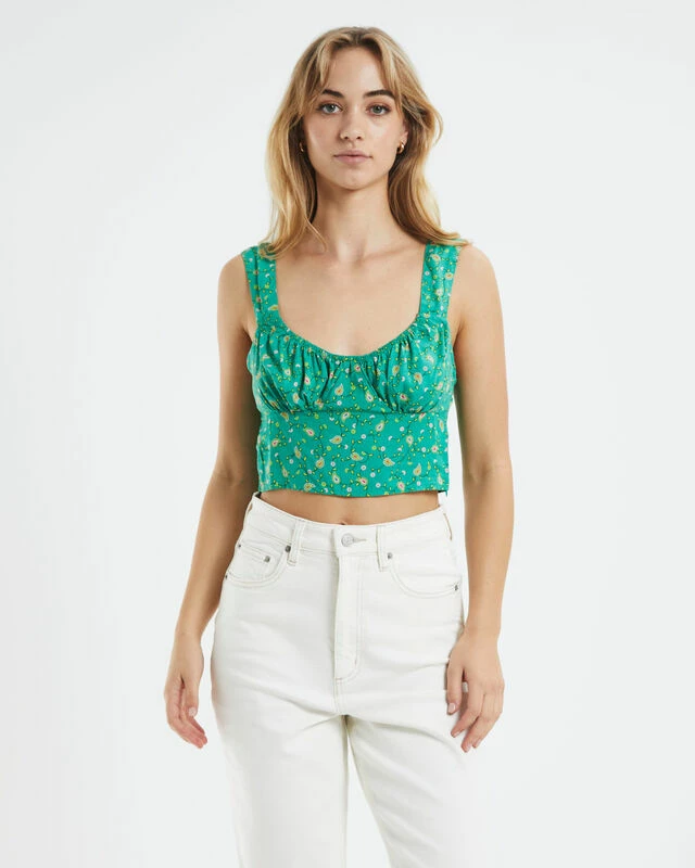 The Gladis Top by Motel Rocks comes in a green colourway with floral print. This style is cropped and features a scooped neckline, thick shoulder straps and gathered bust detailing. Pair it back with white jeans and Converse for an easy everyday look.