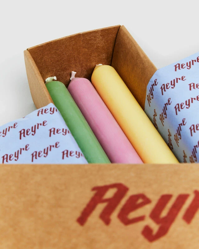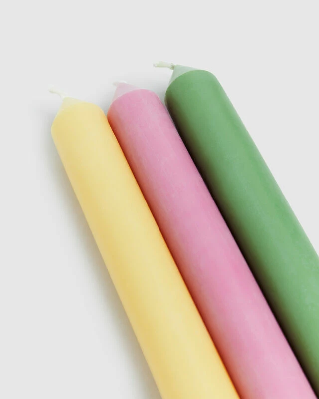 The GP Exclusive Taper Candle Set comes in a pack of 3 stick candles. The candles come in an assorted colourway including yellow, pink and green.