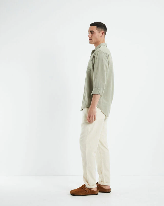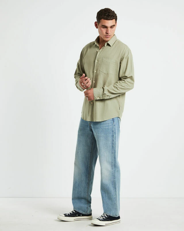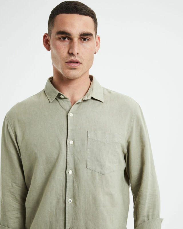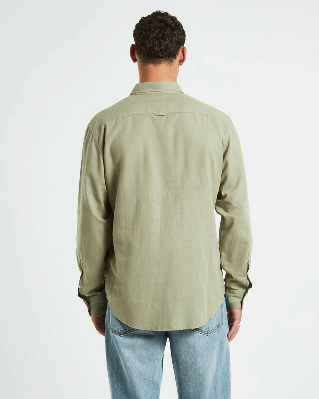 The Grover Long Sleeve Linen Shirt by Arvist comes in a moss green colourway. This style features a relaxed fit, button up front, collared neckline, long sleeves and a curved hemline. Pair this back with white linen shorts and low cut Converse for a vacay style.