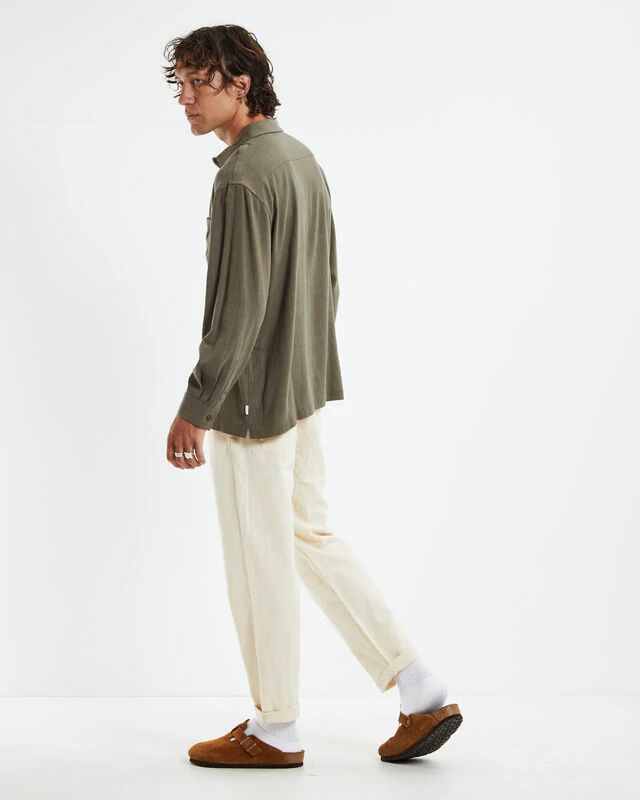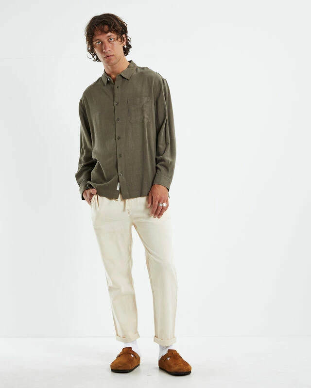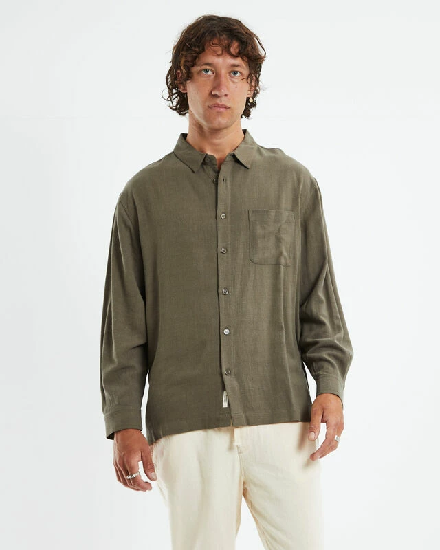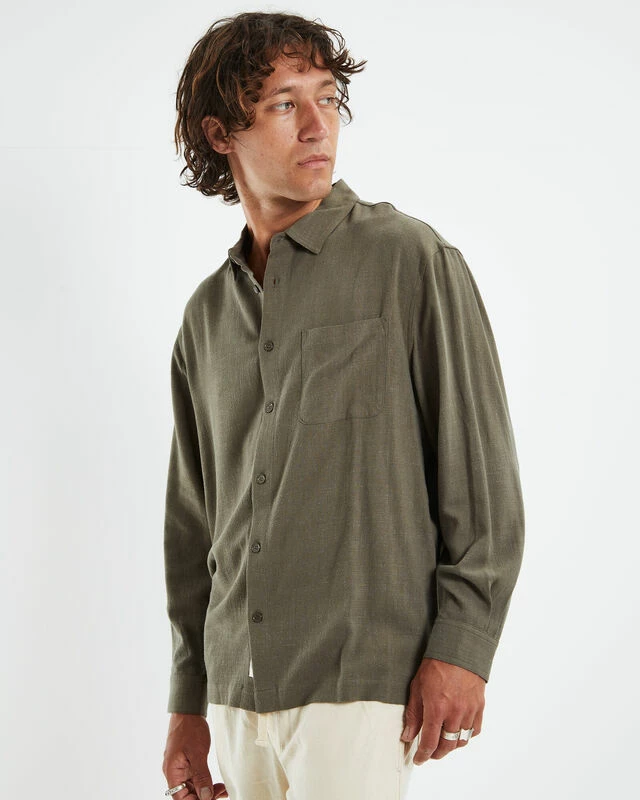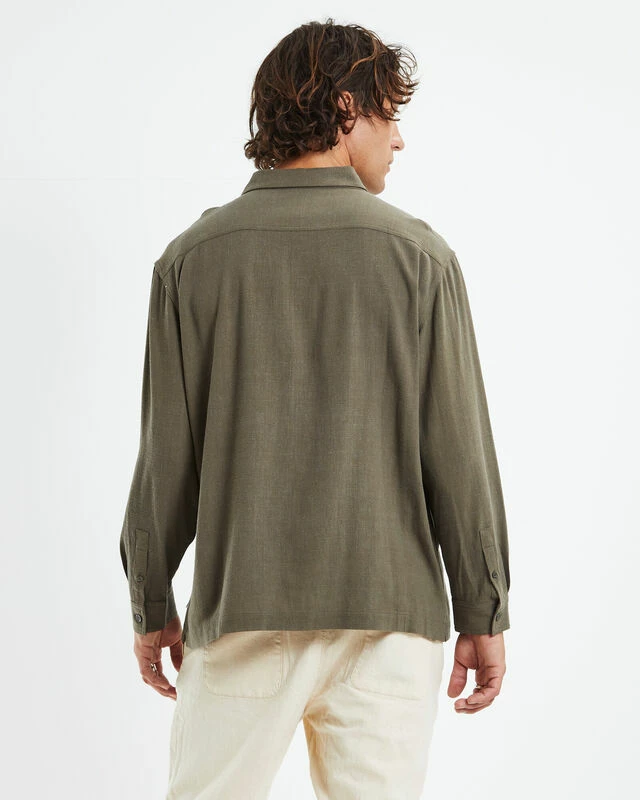 The Harrison Linen Shirt by Arvust comes in an olive green colourway, made from a lightweight linen blend. This design features a left chest pocket, collared neckline, straight hem, button closure, regular fit and long sleeves. Team it back with chino shorts and low cut Converse for an effortless day to night style.
