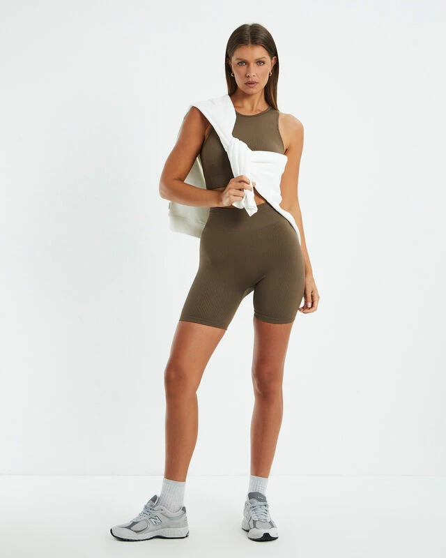 The High Neck Sports Crop Top by Subtitled Sports Club comes in a cocoa brown colourway. The crop top features a round neckline, sleeveless sport cut, removeble padding, signature branding on the rear and is crafted in a stretch ribbed fabrication. Make it a two-piece set with the Bike Shorts Cocoa Brown.