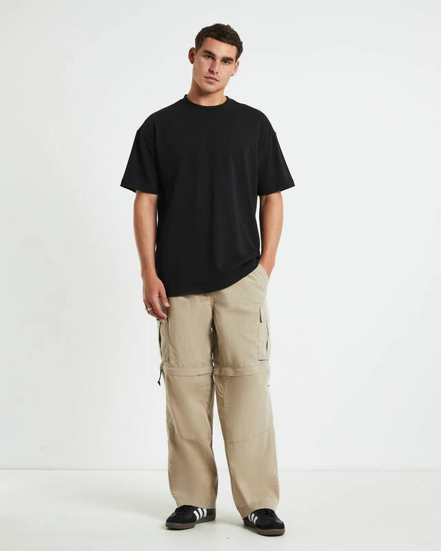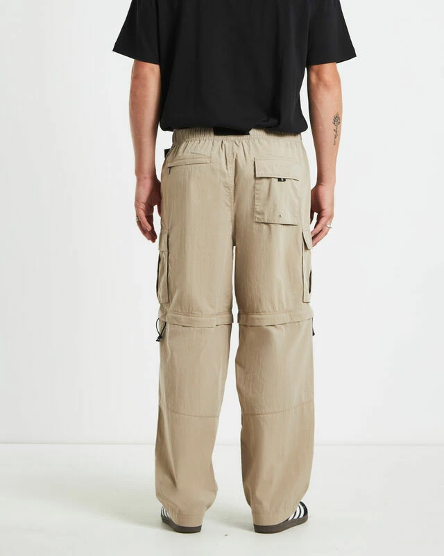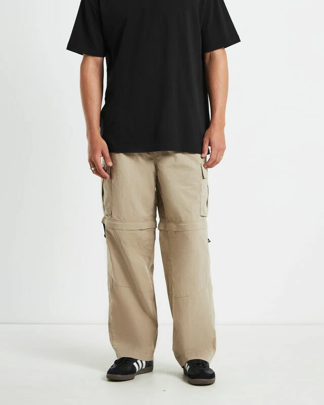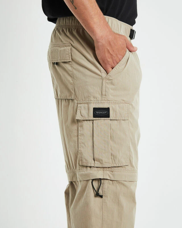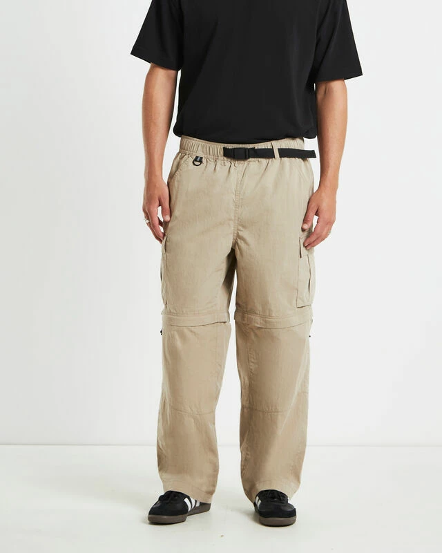 The Hiker Pant by Spencer Project comes in a sand colourway and is designed with a unique detachable lower leg and can be worn as shorts. This style features a relaxed fit, utility pockets, elasticated waistband, adjustable clip belt and branded patchwork.