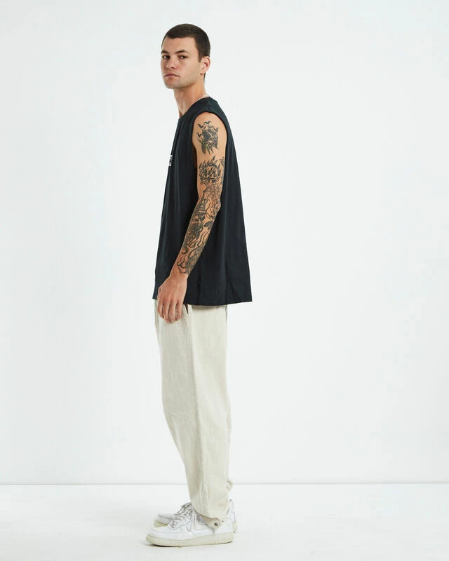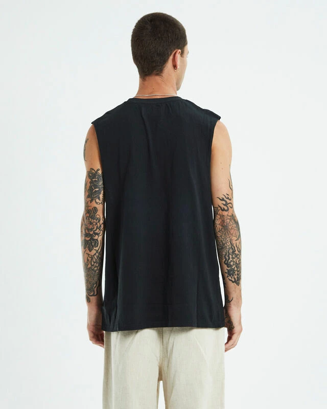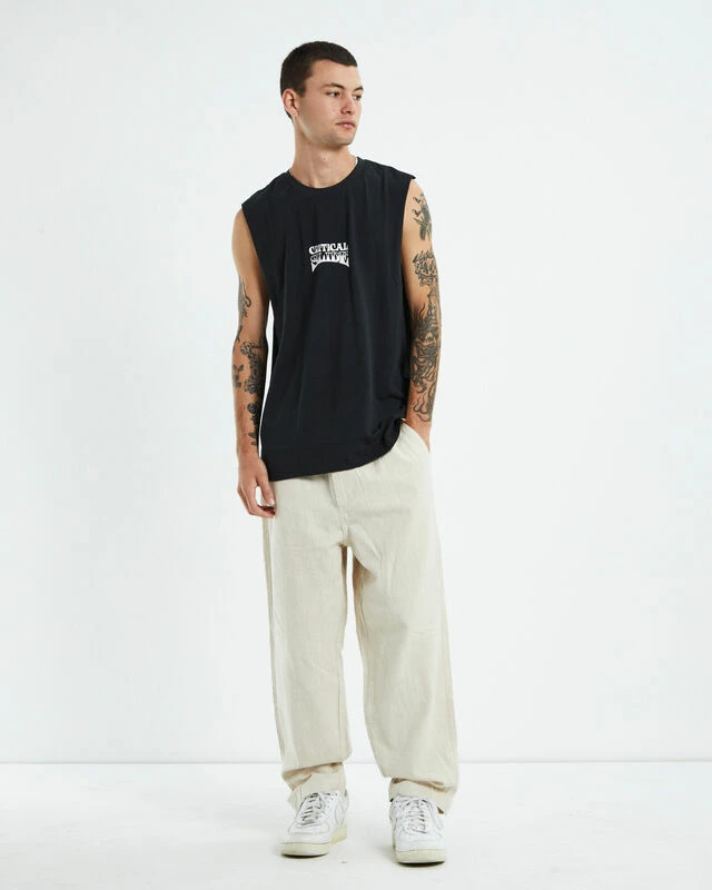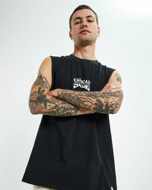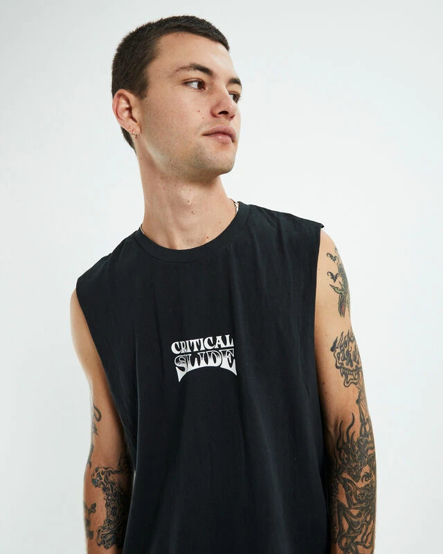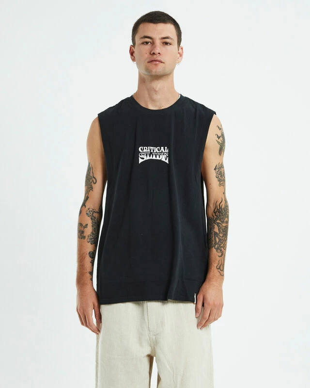 The Horizon Muscle Tee by Critical Slide Society comes in a black colourway. This style is a regular fit, sleeveless style t-shirt and features signature branding at the centre chest and a straight hem. Style with linen pants and white sneakers for a chilled, everyday look.