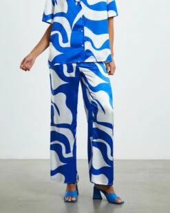 The Indi Pant by SNDYS come in a blue swirl colourway and have a relaxed fit. The pants are designed with an elasticated waistband, full length and are crafted in a satin-like fabrication.