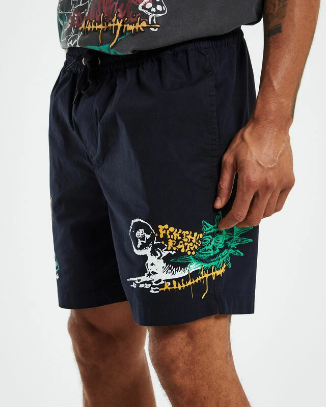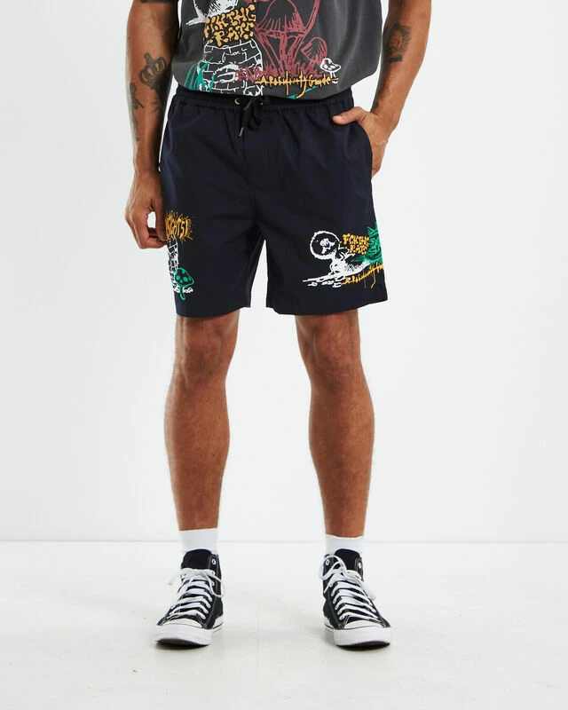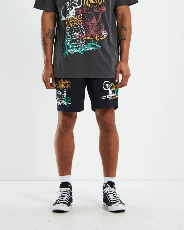 The Afters Walkshorts by Insight are a regular fitting shorts. The shorts are a black colourway and feature a graphic print on both legs. The shorts are constructed with three pockets and a drawstring, elasticated waistband. Pair it back with a plain tee for a effortless casual look.