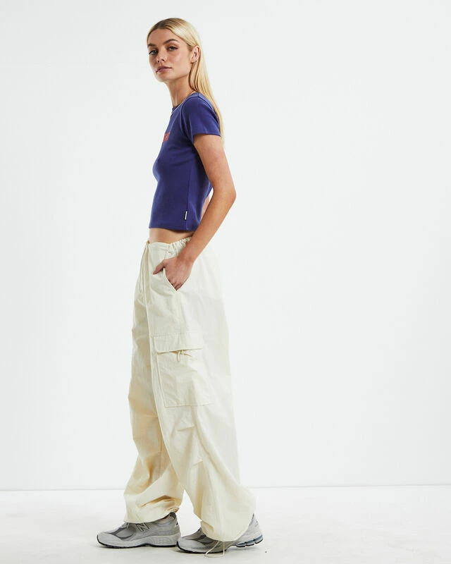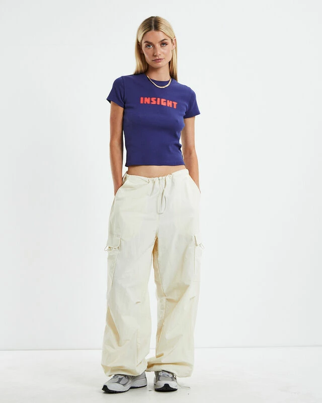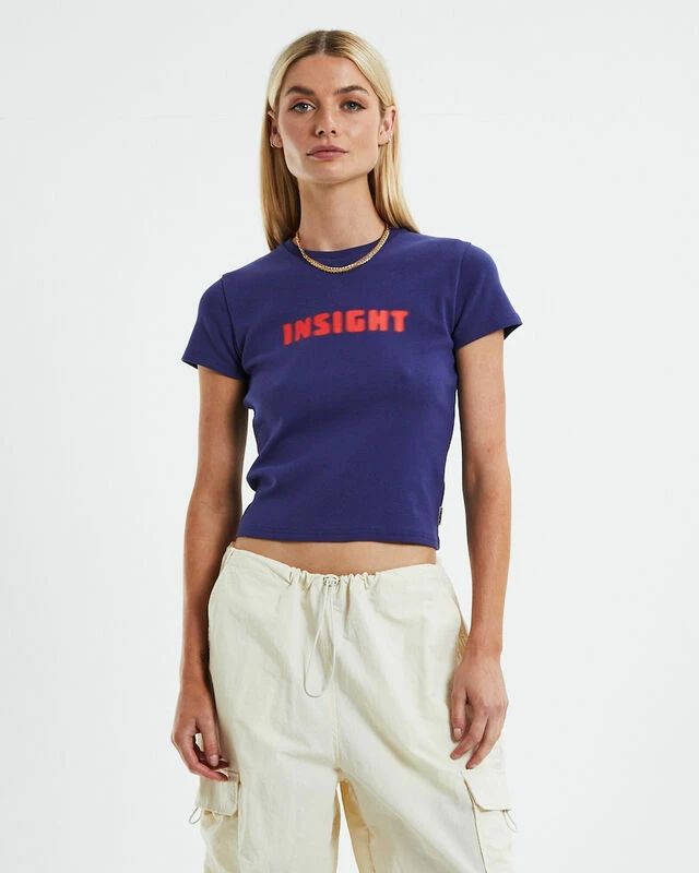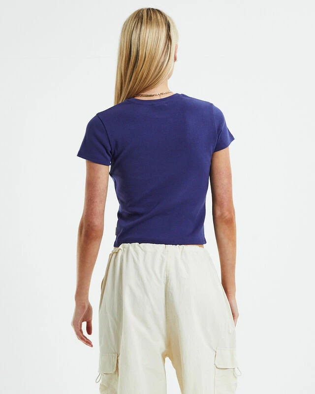 The Dazed & Confused Longline T-Shirt by Insight comes in a navy colourway and is cropped to the hips . The top is a fitted and features contrast signature branding on centre-chest, short sleeves and a crew neckline. Style with low rise parachute pants and sneakers for 90’s inspired look.