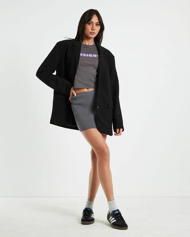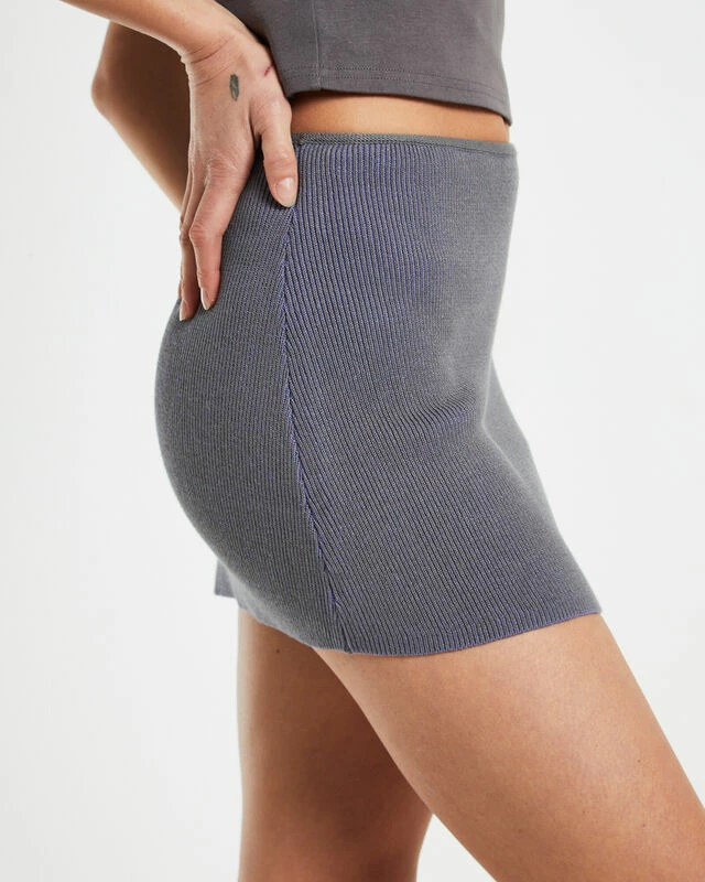 The Echo Rib Mini Skirt by Insight comes in a charcoal colourway. This style is designed with a mini length, ribbed knit stretch fabrication, elasticated waistband and slim fit.