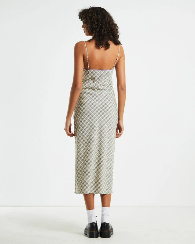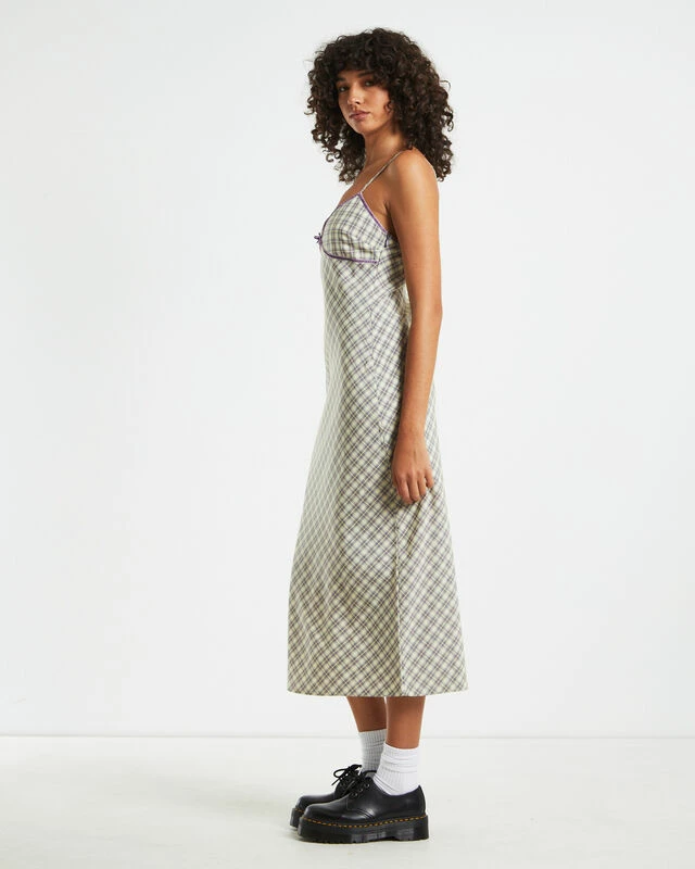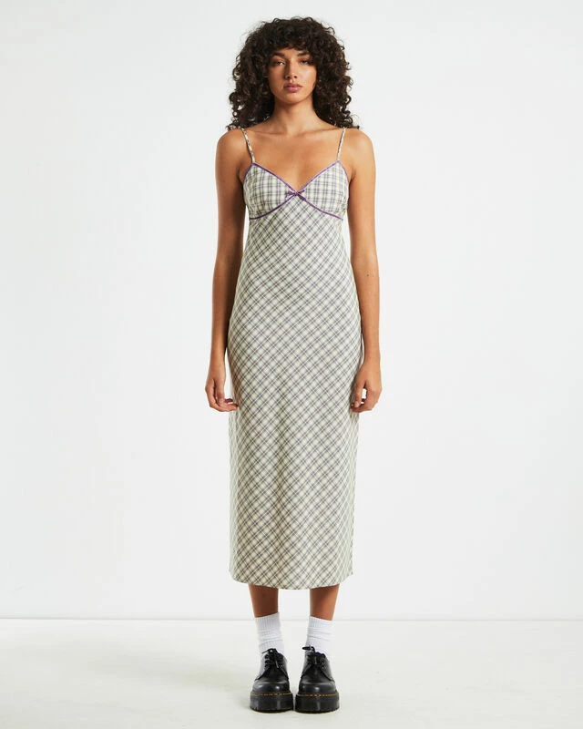 The Jenny Plaid Bias Midi Dress by Insight comes in a multi colourway featuring a plaid bias pattern. The dress is designed in a midi length featuring thin adjustable straps, purple velvet trim on the neckline and bodice with bow detail and a concealed side zipper.