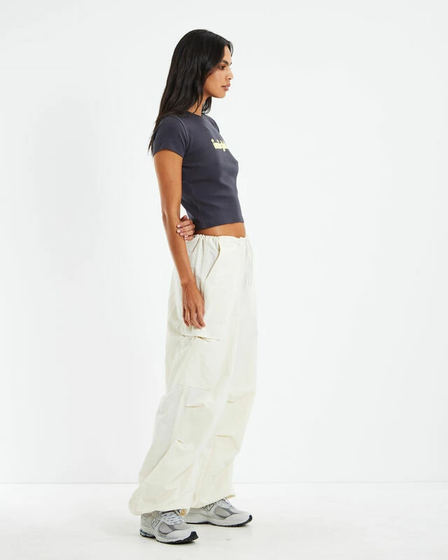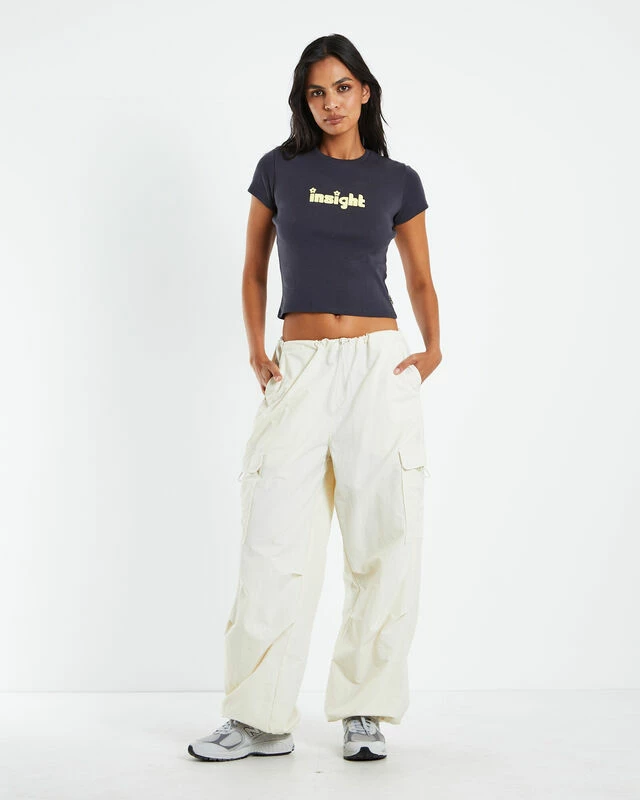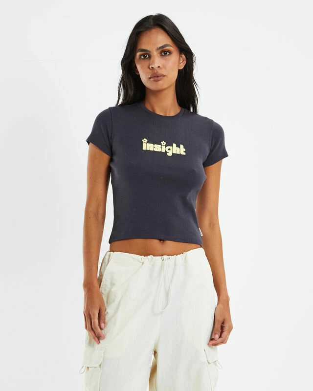 The Lennon Longline Baby Tee by Insight is cropped to the hips and is a fitted design. The tee comes in a slate grey colourway with a yellow branded cloud print on centre-chest. It features short sleeves and a flattering high neckline. Complete the look with low-rise cargo pants and sneakers for a relaxed Y2K vibe.