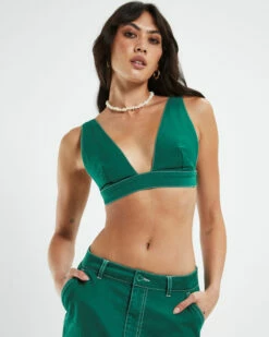 The Myla Carpenter Bralette by Insight is a green colourway with white stitching. The bralette has a V-neckline and features an eslitacated backi, adjustable straps and a hook-eye clasp. Make it a two-piece set with the Myla Carpenter Maxi Skirt.