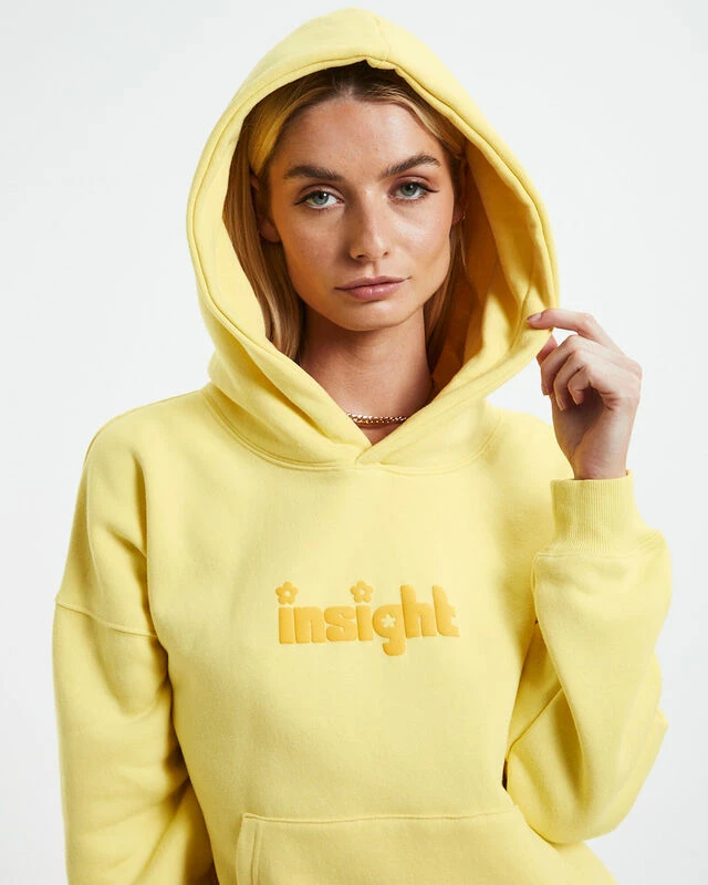 The Peggy Puff Print Fleece Hoodie by Insight is constructed with a soft fleece interior and is perfect for cooler weather. This style comes in a yellow colourway and features a orange puff print logo across centre chest, a drawstring hood, kangaroo pouch, long sleeves and ribbed cuffs and hem. Pair it back with high-rise jeans and sneakers for a cosy fit.