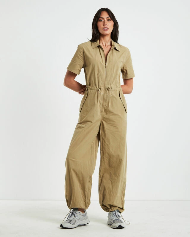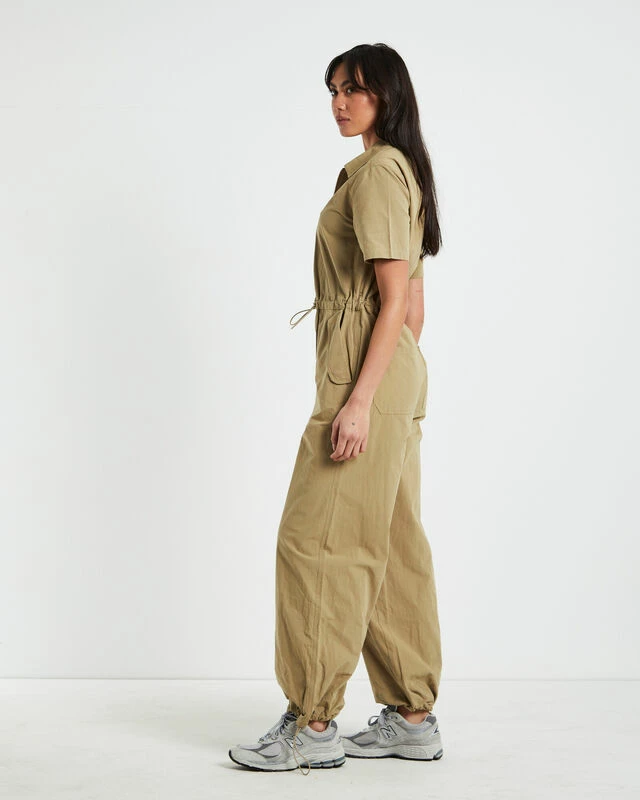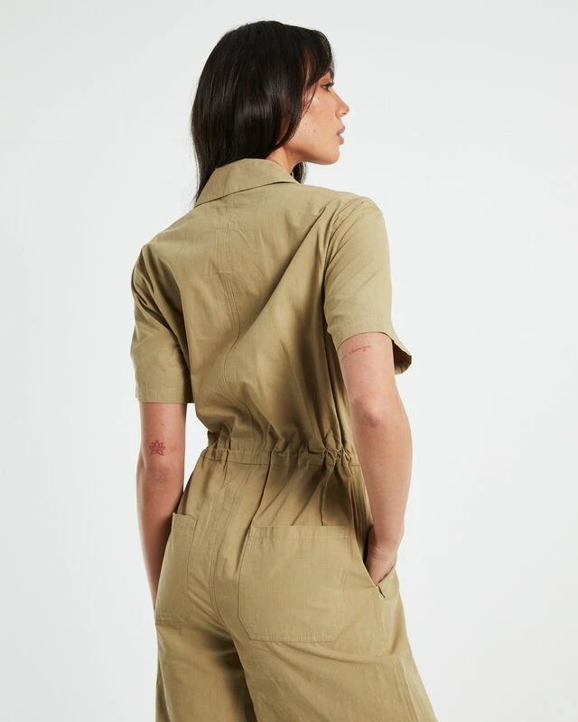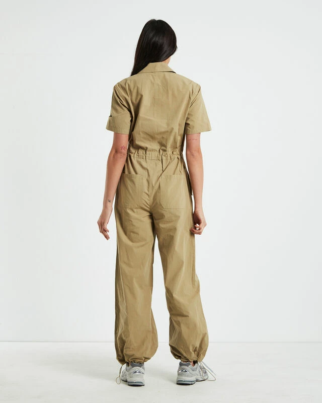 The Riley Tech Boiler Suit by Insight comes in a beige colourway. This style is designed with a zip-front, bungee cinch drawcord at the waistband and ankes, collared neckline, short sleeves and four pockets.