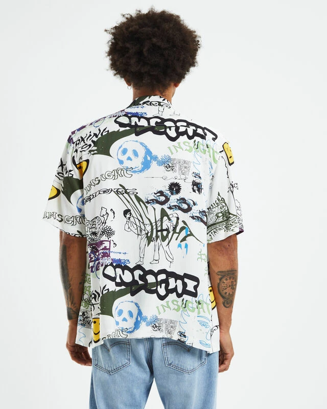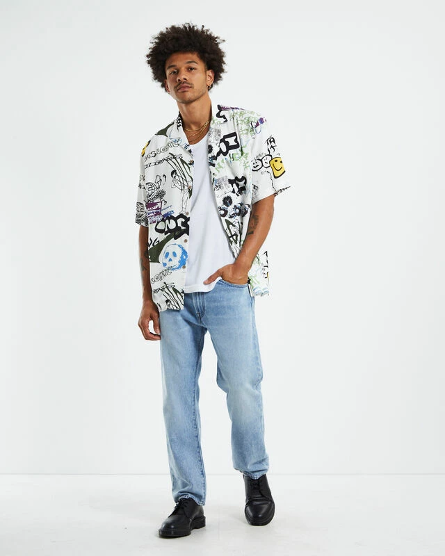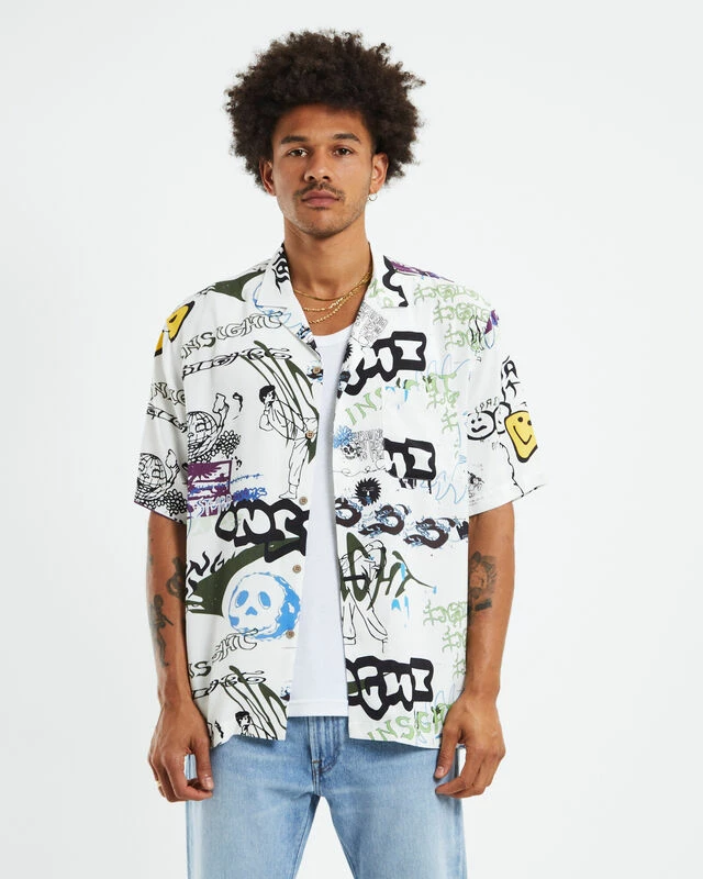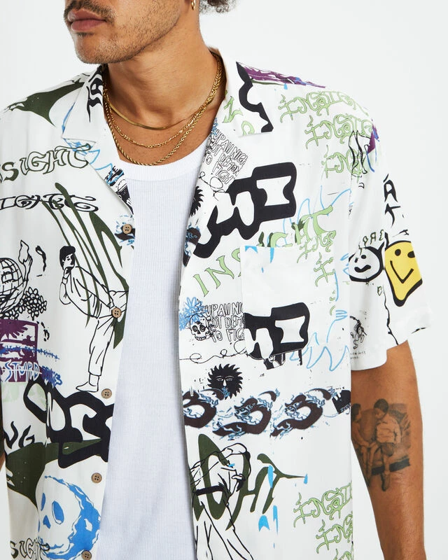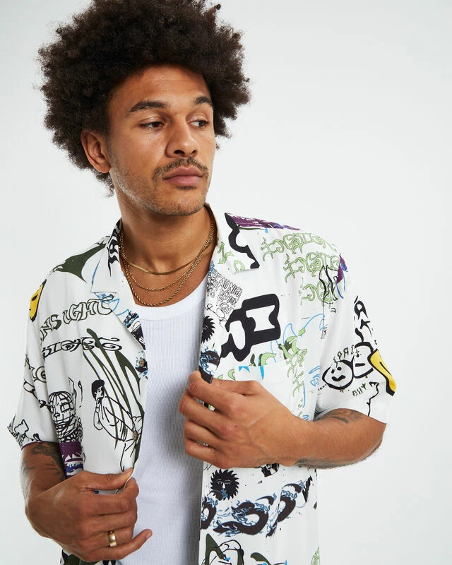 The Storytime Short Sleeve Resort Shirt is a white colourway with a graffiti graphic print. The shirt has short sleeves, a collared neckline, button-up front and left chest pocket. This is a classic piece you can pair with any pants to create different styles.