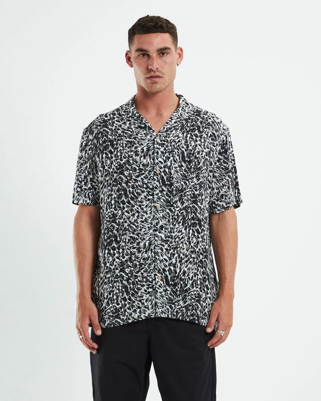 The Wilder Short Sleeve Shirt by Insight comes in a black and white animal print design. The shirt is a relaxed fit and features a button-up front, short sleeves, collared neck and left chest pocket. Style it with denim shorts and high top Converse for a casual evening look.