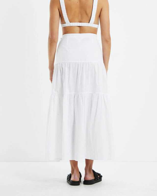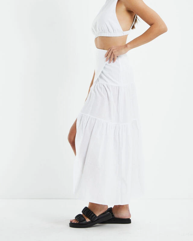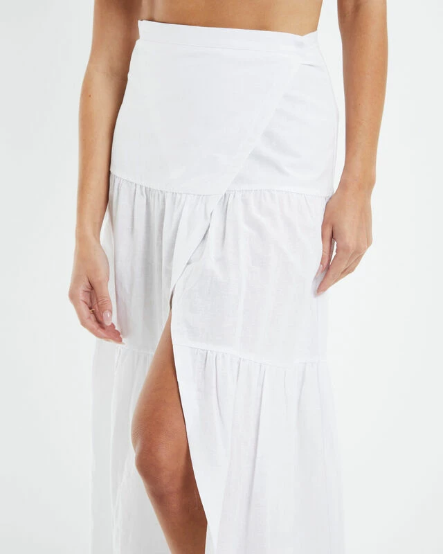 The Ivy Wrap Linen Tiered Skirt by Subtitled comes in a white colourway. The skirt features a premium linen blend fabrication, tiered design, long diagonal split with hook clasp closure, wrap design with inner button closure, a fitted waistline and high rise design. Make it a two-piece set with the Ivy Elastic Back Top.