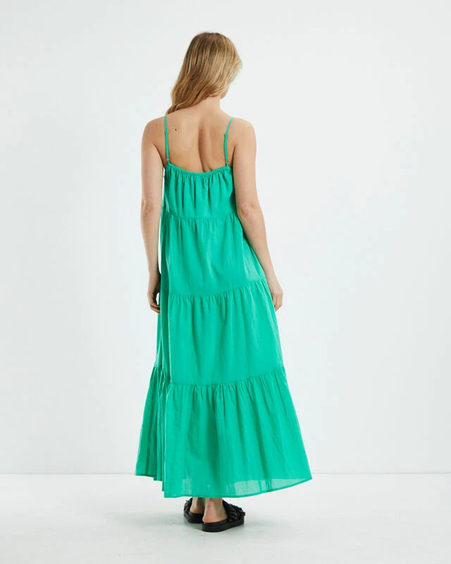 The Jenna Maxi Dress by Charlie Holiday comes in a green colourway. The maxi dress is designed with cascading tiers and is a loose fit. Featuring adjustable spaghetti straps and a square neckline. Pair it back with black sandals and gold jewellery for a chill afternoon look.