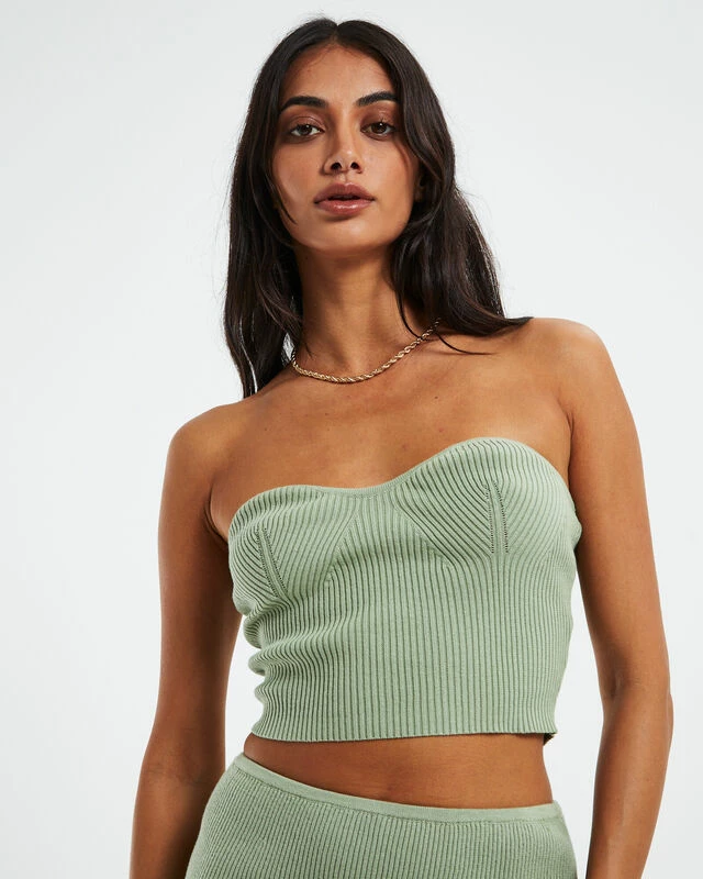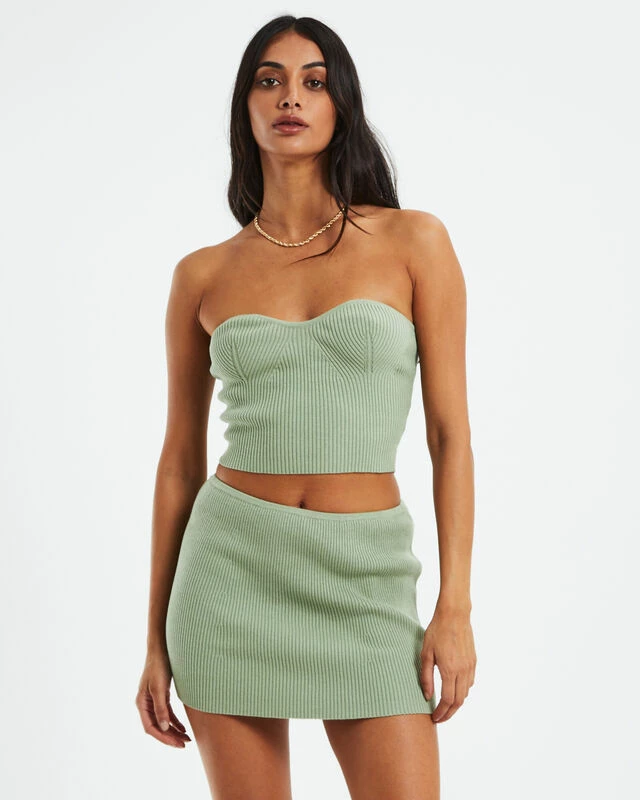 The Kirby Knit Tube Top by Subtitled comes in a green colourway with a stretchy knit fabrication. The top is a strapless design with a sweetheart neckline and cropped length. Make it a two-piece set with the Kirby Knit Tube Skirt.