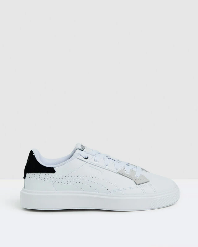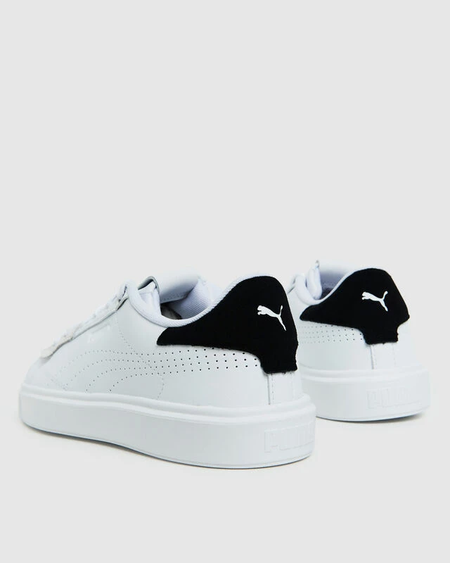 The LAJLA Womens Puma Sneakers by Puma are a white and black colourway, with a low-cut basket silhouette design. Featuring a full leather upper, lace closure for snug fit, leather vamp and tongue label, suede heel cap, IMEVA midsole, rubber outsole and Puma formstrip on sides.