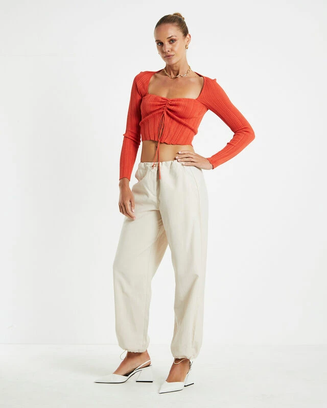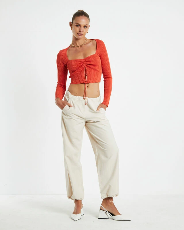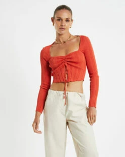 The Layla Butterfly Hem bolero Top by Alice in the Eve comes in a burnt red shade. Crafted in a pleated fabrication with long sleeves and ruching at the chest. Style it with bootcut jeans and black boots to complete the look.