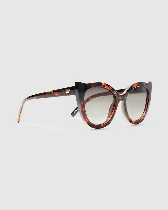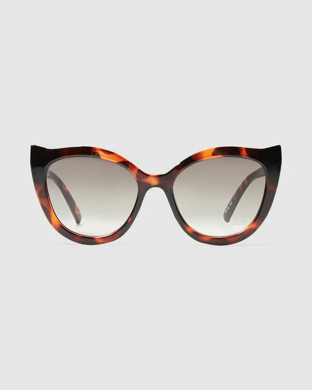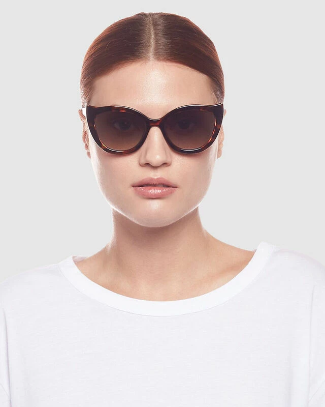 The Flossy Sunglasses by Le Specs are a fashionable cat-eye frame that comes in a tort brown pattern. The lenses are non-polarised and have a smoke gradient tint to them and the glasses also feature a small flag stripe metal trim on each temple.
