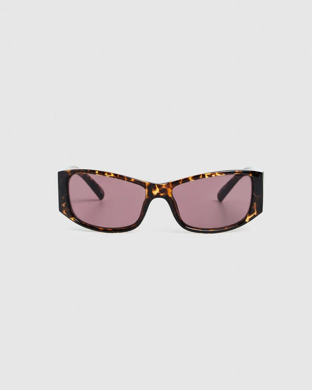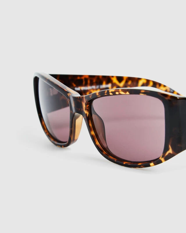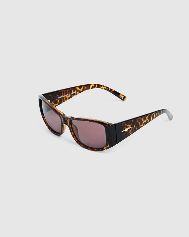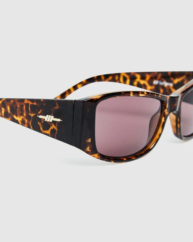 The Exquisite Sunglasses by Le Specs are an updated ’90s sporty silhouette with a slight wraparound fit. The sunglasses come in a tortoiseshell colourway with dark-tinted lenses that are shatterproof and scratch resistant. Featuring gold vintage pinstripe hardware on both temples and a comfortable nose bridge.