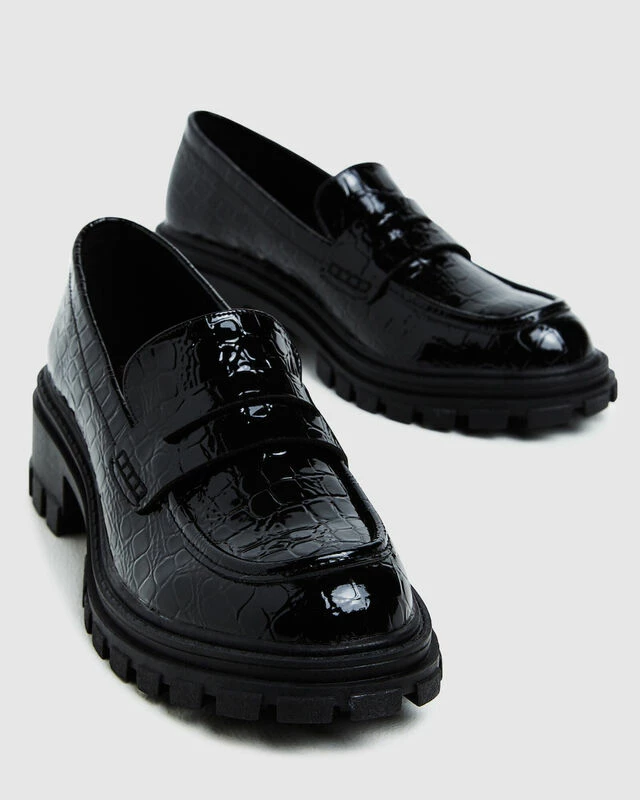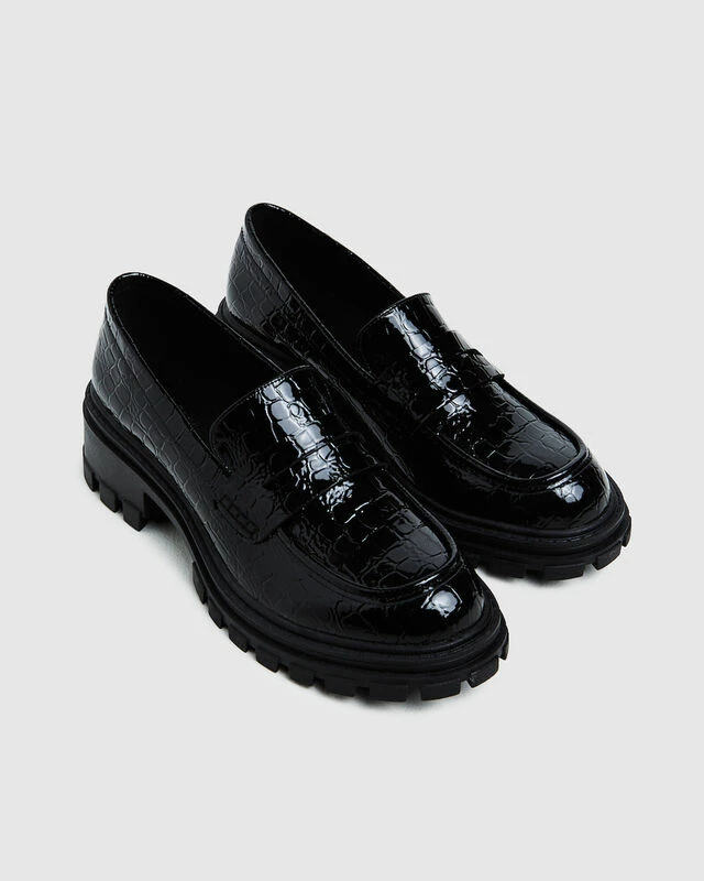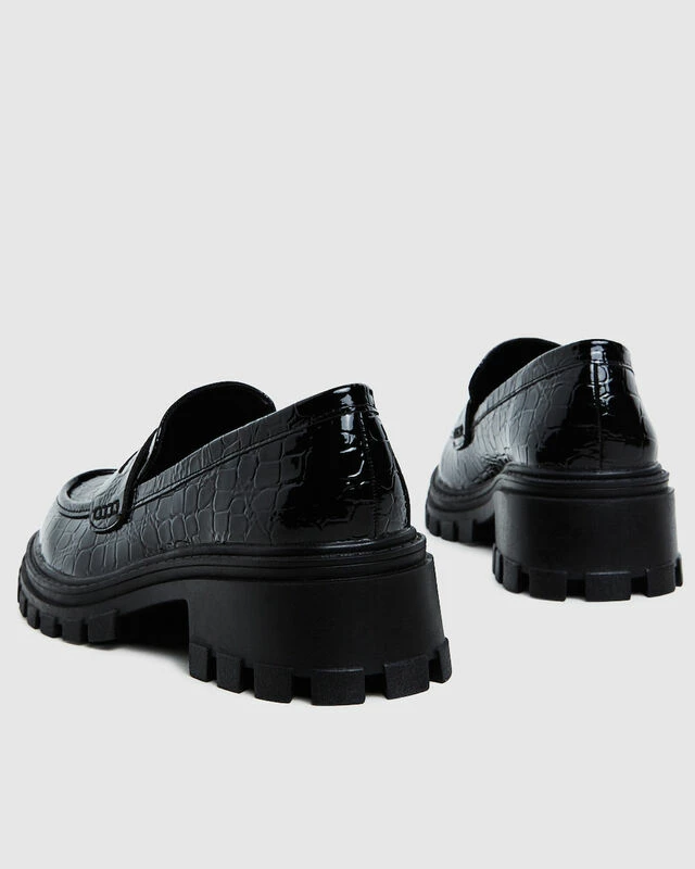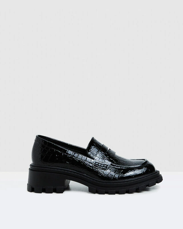 The Lennon Croc Loafer by Alice in the Eve comes in a black colourway and features a luxe croc pattern with a shiny finish. The shoe is designed in a loafer style with a higher sole for extra height and buckle like detailing on the top.